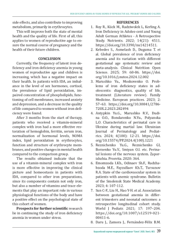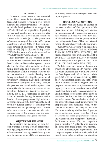 Results: In 2024-2025, in Ukraine, compared to previous years, there is a significant increase in the incidence of latent iron deficiency and iron deficiency anemia among women of reproductive age, pregnant women and children. Meanwhile, in Tajikistan, every third pregnant woman suffers from anemia (from 32.0% to 39.4%). A comparative analysis of the prevalence of anemia among pregnant women living in Ukraine and Tajikistan shows that in the Tajik cohort the level of iron deficiency in 2024 was 1.6 times higher.