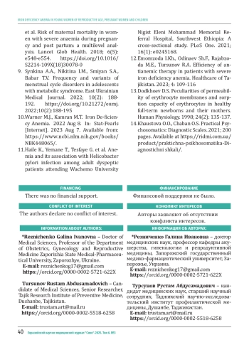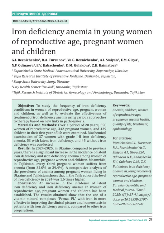 РЕЗНИЧЕНКО Г. И., ТУРСУНОВ Р. А., РЕЗНИЧЕНКО Ю. Г., СМИЯН А. И., ГИРЯ Е. М., ОДИНАЕВА Н. Ф., КАБАЧЕНКО Е. В., ГУЛАКОВА Д. М., БАЙМАТОВА З. К. ЖЕЛЕЗОДЕФИЦИТНАЯ АНЕМИЯ У ЮНЫХ ЖЕНЩИН РЕПРОДУКТИВНОГО ВОЗРАСТА, БЕРЕМЕННЫХ И ДЕТЕЙ // ЕВРАЗИЙСКИЙ НАУЧНО-МЕДИЦИНСКИЙ ЖУРНАЛ "СИНО". 2025. № 3, ТОМ 6