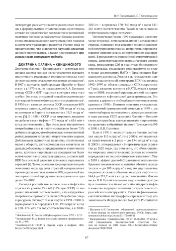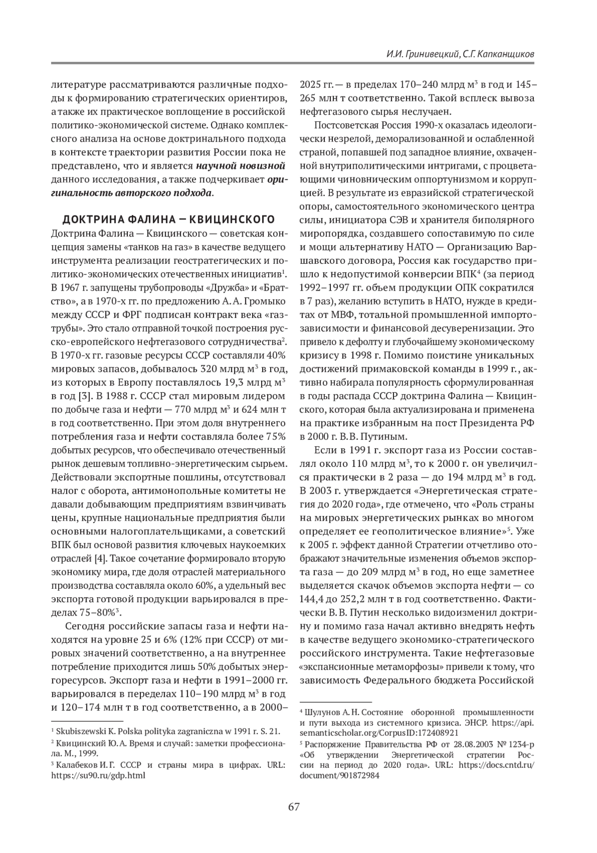 Доктрина Фалина — Квицинского — советская концепция замены «танков на газ» в качестве ведущего инструмента реализации геостратегических и политико-экономических отечественных инициатив1. В 1967 г. запущены трубопроводы «Дружба» и «Братство», а в 1970-х гг. по предложению А. А. Громыко между СССР и ФРГ подписан контракт века «газтрубы».