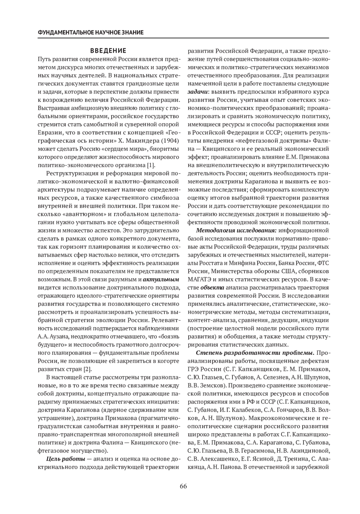 Работа посвящена системной оценке политико-экономического и стратегического пути развития России. Актуальность статьи вызвана несовершенством долгосрочного, рационального и комплексного подходов в стратегическом целеполагании, накладывающем свой отпечаток на внешнюю и внутреннюю экономическую и политическую деятельность Российской Федерации. В ходе анализа выявлено, что успешная деятельность Правительства Е. М. Примакова вывела государство из глубочайшего экономического кризиса. Это создало фундамент для выстраивания последовательной внешнеполитической деятельности, опирающейся на столпы примаковской доктрины. При этом российские политические деятели не использовали «исторический шанс», позволяющий за счет нефтегазового сырья придать ускорение интенсификации и эволюции экономической системы страны. «Фиаско государства» привело к неутешительным экономическим результатам, что делает релевантным постепенное и грамотное применение «ядерной» доктрины Караганова. Можно говорить, что российская действительность сегодня такова: угрожаем доктриной Караганова, мечтаем о доктрине Примакова, а живем по доктрине Фалина-Квицинского.