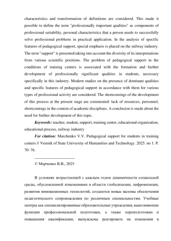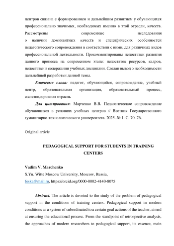 Статья посвящена исследованию проблемы педагогического сопровождения в условиях учебных центров. Педагогическое сопровождение в современных условиях как система подчиненных определенной цели действий педагога, направлено на обеспечение образовательного процесса. С позиций ретроспективного анализа рассмотрены подходы современных исследователей к педагогическому сопровождению, его сущности, основным характеристикам и трансформации дефиниций. Это позволило определить термин «профессионально важные качества» как компоненты профессиональной пригодности, личностные особенности, которые необходимы человеку для успешного решения профессиональных задач в практическом применении. В анализе специфических особенностей педагогического сопровождения сделан особый акцент на железнодорожную отрасль. Термин «сопровождение» представлен с учетом разнообразия его трактовок с различных научных позиций. Проблема педагогического сопровождения в условиях учебных центров связана с формированием и дальнейшим развитием у обучающихся профессионально значимых, необходимых именно в этой отрасли, качеств. Рассмотрены современные исследования о наличии доминантных качеств и специфических особенностей педагогического сопровождения в соответствии с ними, для различных видов профессиональной деятельности. Прокомментированы недостатки развития данного процесса на современном этапе: недостаток ресурсов, кадров, недостатки в содержании учебных дисциплин. Сделан вывод о необходимости дальнейшей разработки данной темы.