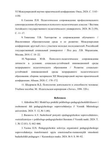 2. Баранова А.В. Сущность понятий “педагогическое сопровождение”, “социализация” в психолого-педагогической литературе // Вестник науки. 2024. Т. 1. № 12 (81). С. 662-666. EDN: HDMYUC