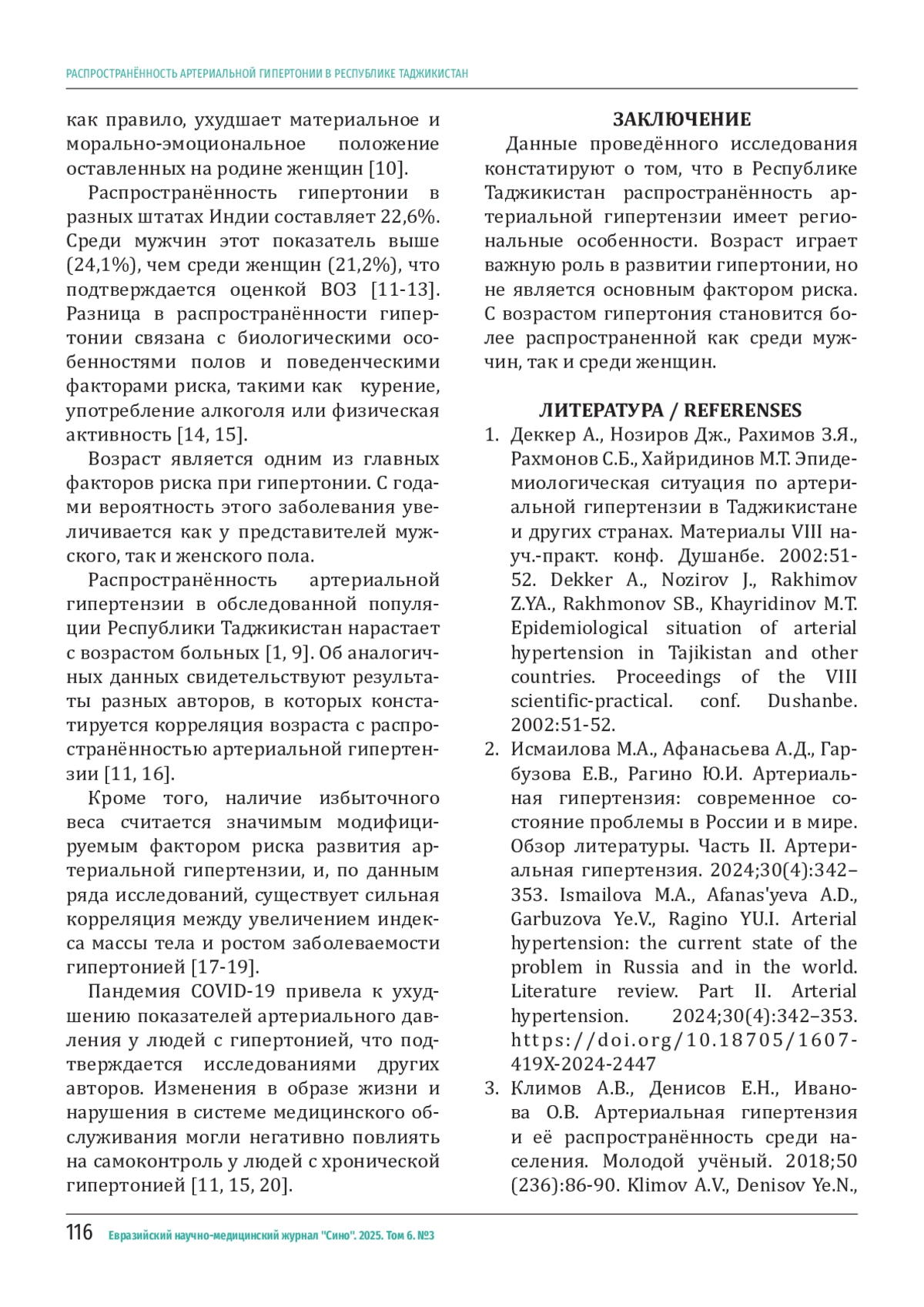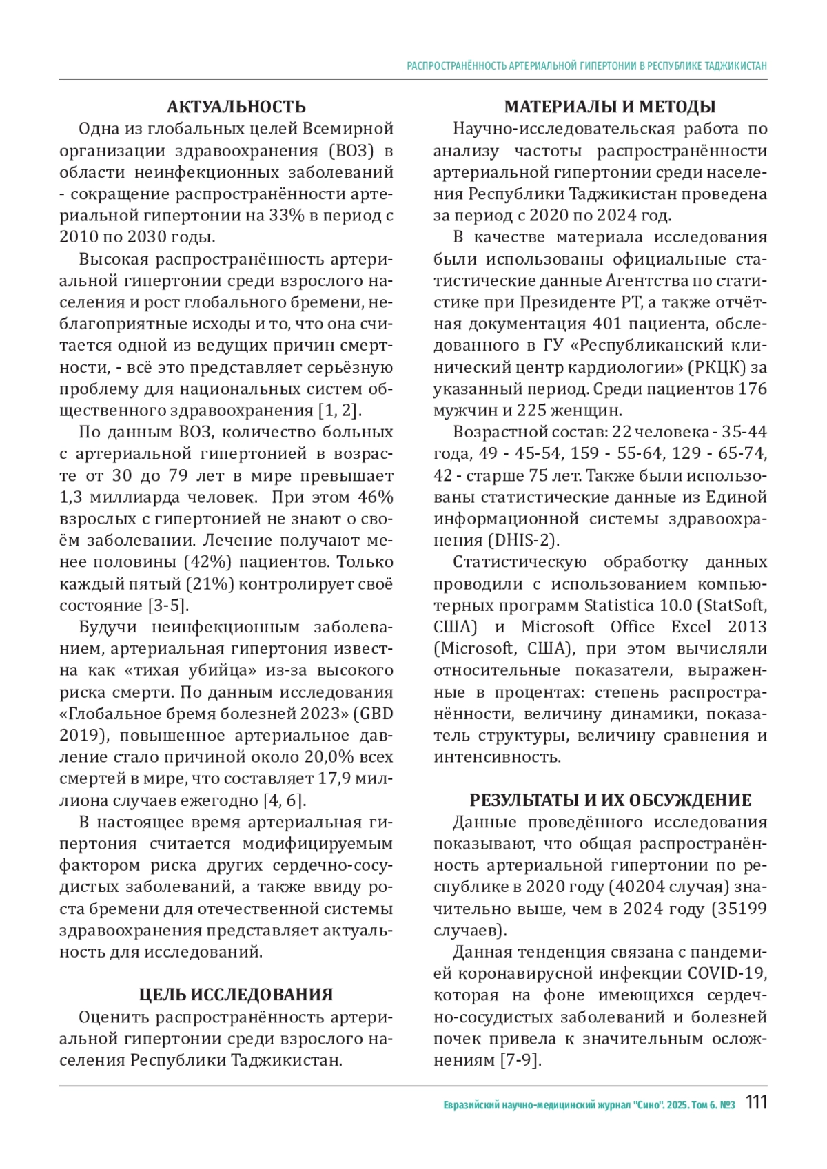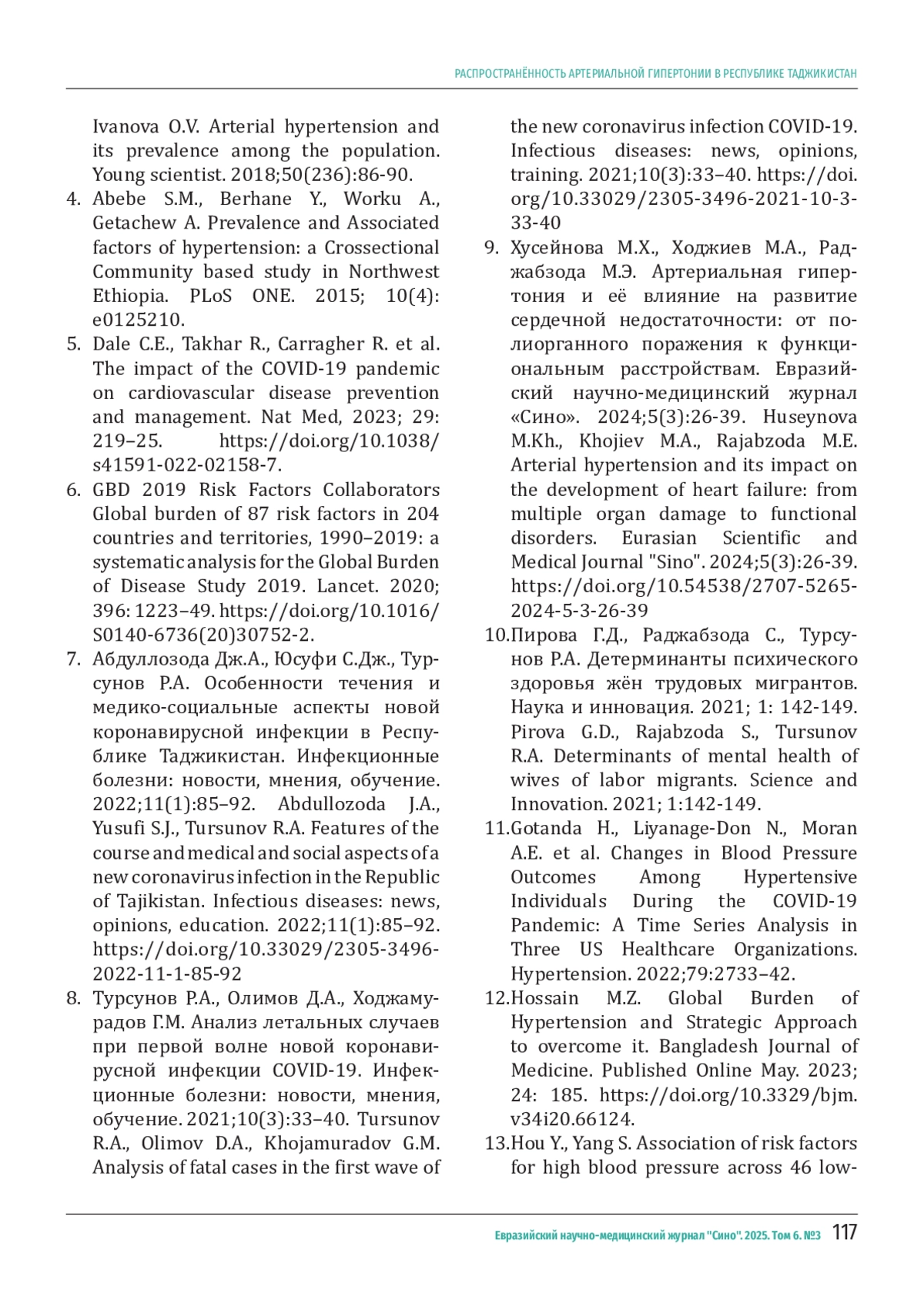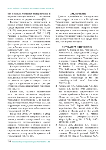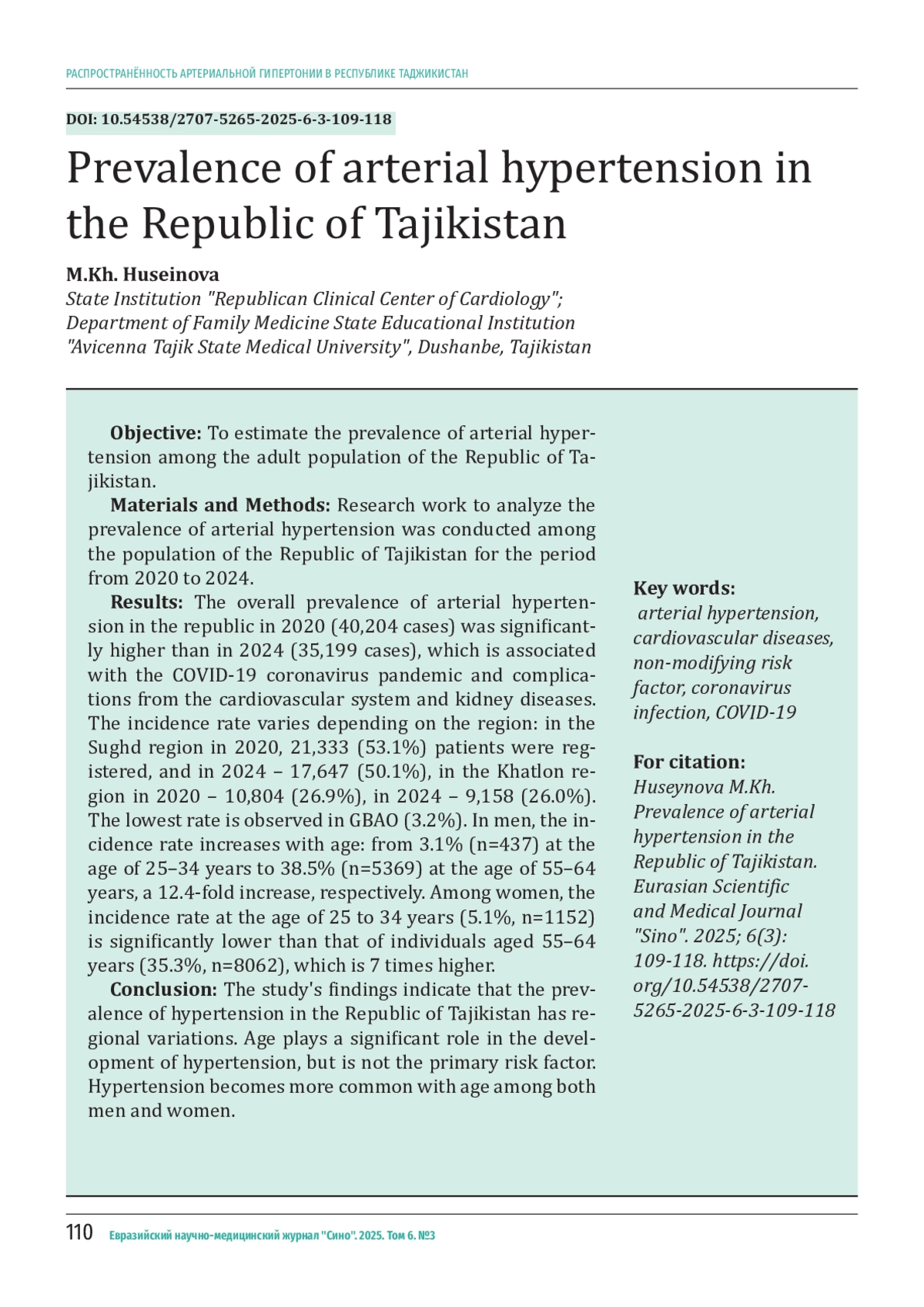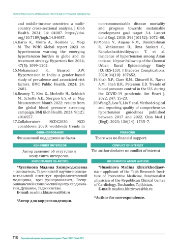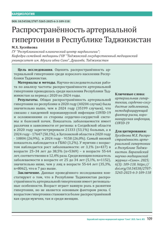 ХУСЕЙНОВА М. Х. РАСПРОСТРАНЁННОСТЬ АРТЕРИАЛЬНОЙ ГИПЕРТОНИИ В РЕСПУБЛИКЕ ТАДЖИКИСТАН // ЕВРАЗИЙСКИЙ НАУЧНО-МЕДИЦИНСКИЙ ЖУРНАЛ "СИНО". 2025. № 3, ТОМ 6