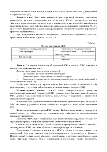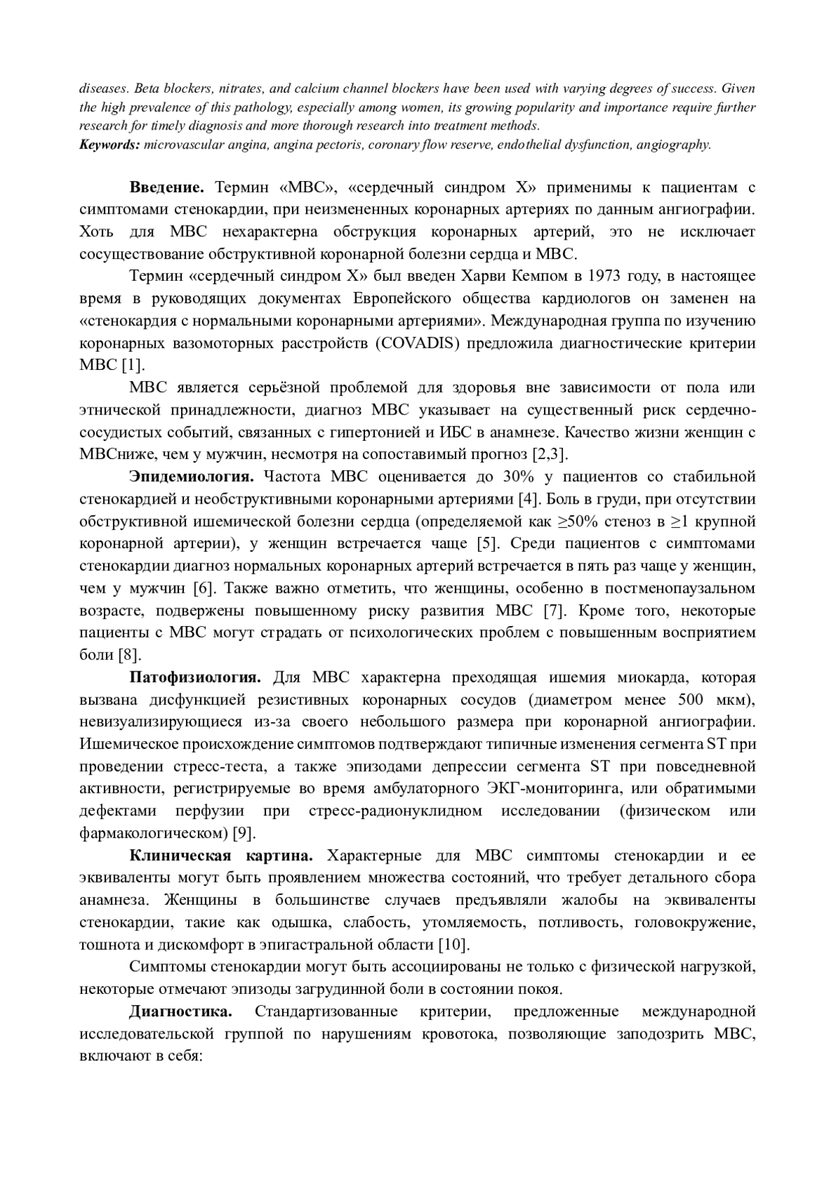 В настоящее время все более возрастает настороженность в отношении микроваскулярной стенокардии (МВС), так как микрососудистая дисфункция представляет риск возникновения сердечно-сосудистых осложнений. Микрососудистые заболевания коронарных артерий представляется возможным диагностировать при помощи инвазивного тестирования коронарной реактивности и неинвазивных методов, таких как эхокардиография, компьютерная томография, магнитно-резонансная томография и позитронно-эмиссионная томография. К сожалению, лечение в большей степени эмпирическое и не так хорошо изучено с помощью рандомизированных исследований, как при других заболеваниях. Бета-адреноблокаторы, нитраты и блокаторы кальциевых каналов применялись с разной степенью успеха. С учетом высокой распространённости данной патологии, особенно среди женщин, его растущая популярность и важность требуют дальнейших исследований для своевременной диагностики и более тщательных исследований методов лечения.