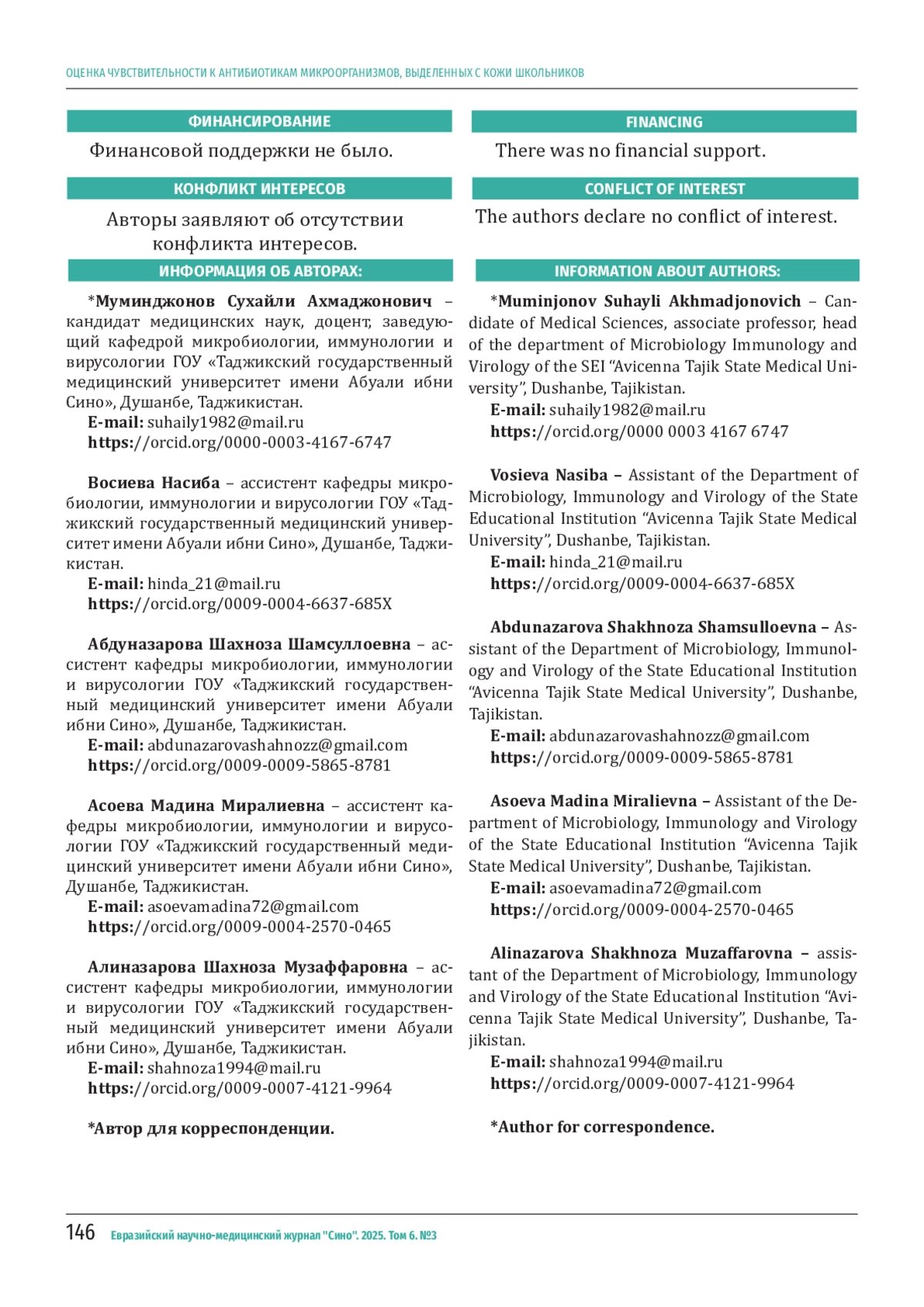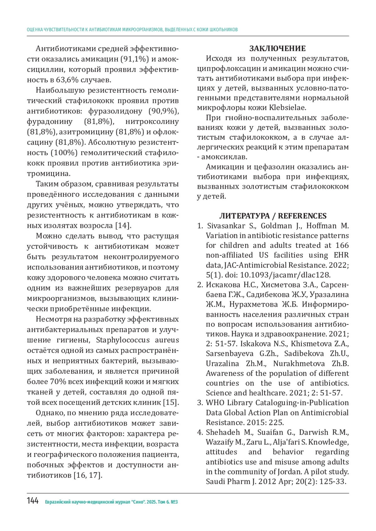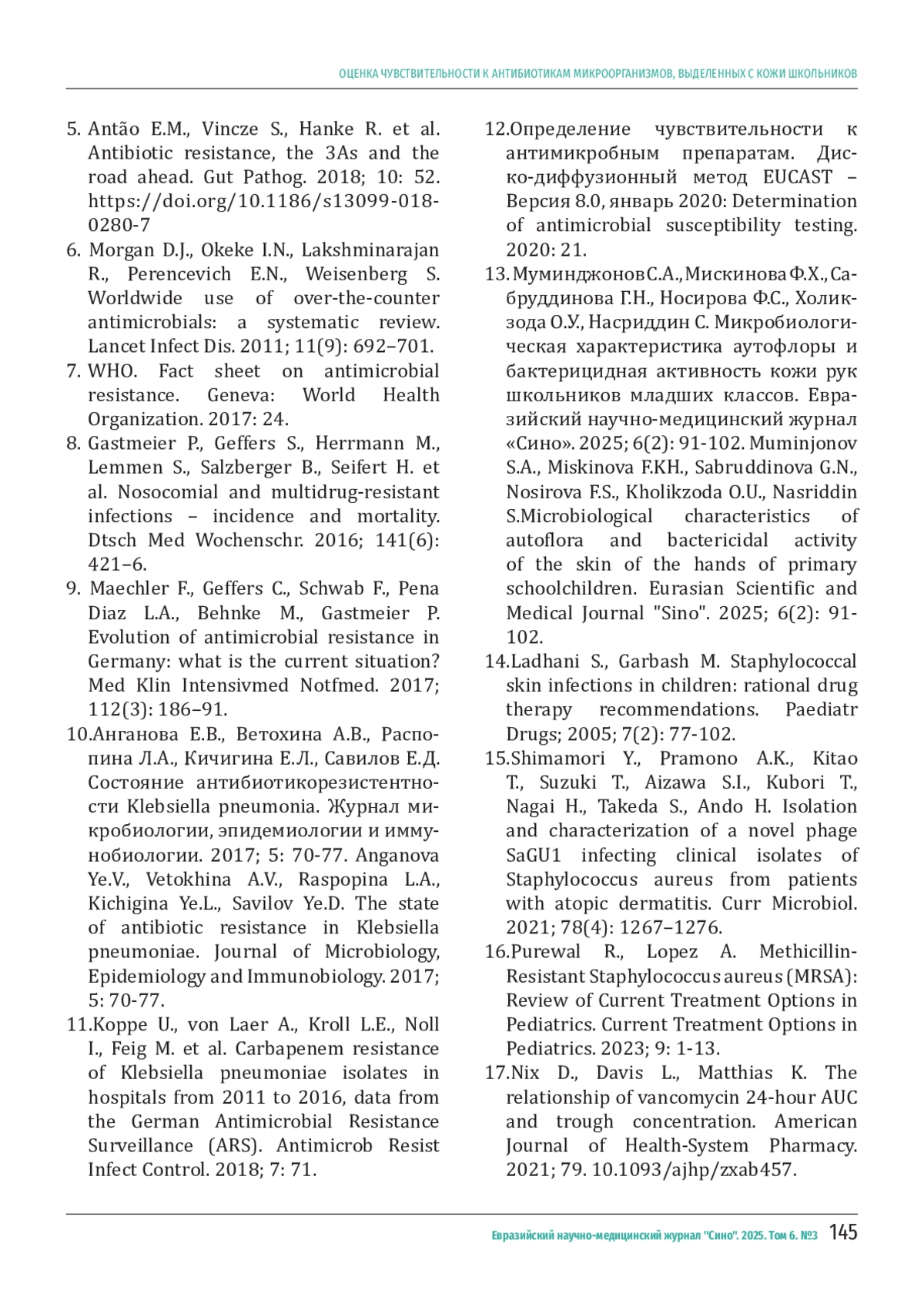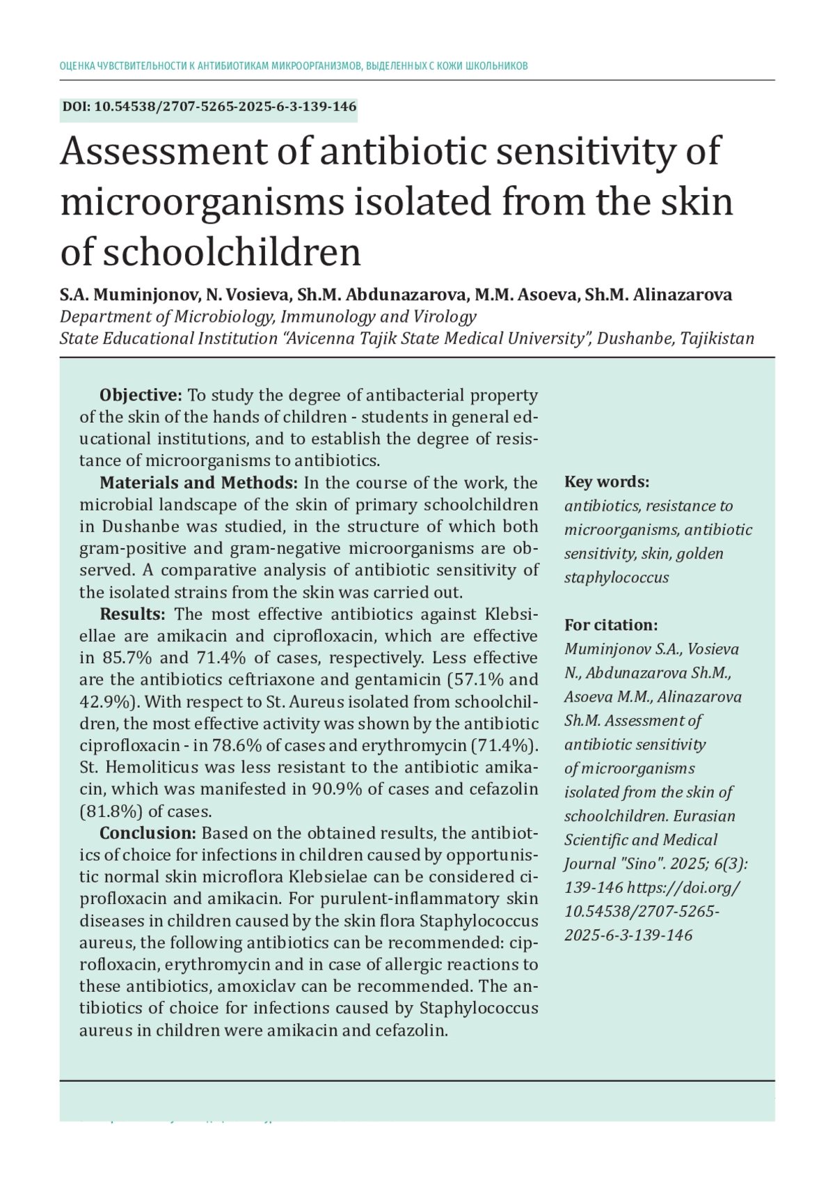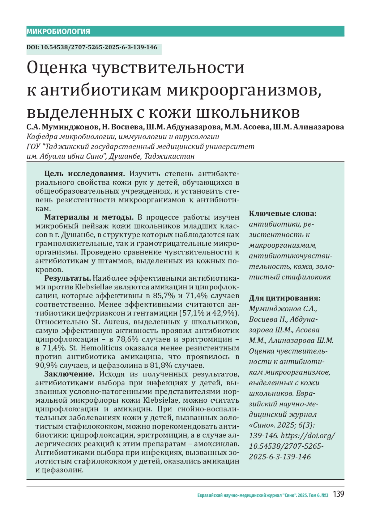 МУМИНДЖОНОВ С. А., ВОСИЕВА Н., АБДУНАЗАРОВА Ш. Ш., АСОЕВА М. М., АЛИНАЗАРОВА Ш. М. ОЦЕНКА ЧУВСТВИТЕЛЬНОСТИ К АНТИБИОТИКАМ МИКРООРГАНИЗМОВ, ВЫДЕЛЕННЫХ С КОЖИ ШКОЛЬНИКОВ // ЕВРАЗИЙСКИЙ НАУЧНО-МЕДИЦИНСКИЙ ЖУРНАЛ "СИНО". 2025. № 3, ТОМ 6