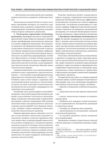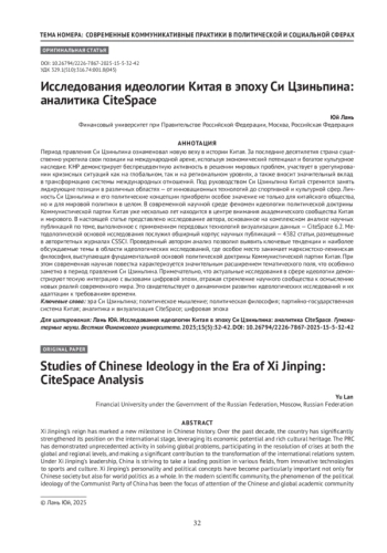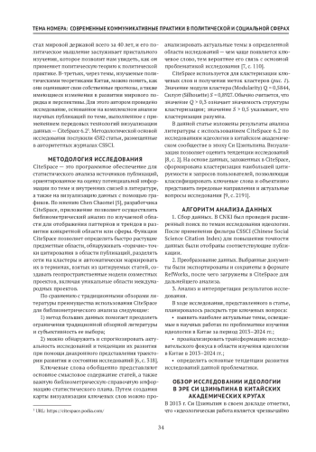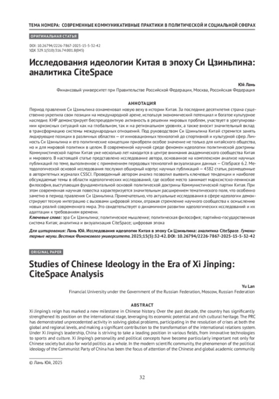 Период правления Си Цзиньпина ознаменовал новую веху в истории Китая. За последние десятилетия страна существенно укрепила свои позиции на международной арене, используя экономический потенциал и богатое культурное наследие. КНР демонстрирует беспрецедентную активность в решении мировых проблем, участвует в урегулировании кризисных ситуаций как на глобальном, так и на региональном уровнях, а также вносит значительный вклад в трансформацию системы международных отношений. Под руководством Си Цзиньпина Китай стремится занять лидирующие позиции в различных областях — от инновационных технологий до спортивной и культурной сфер. Личность Си Цзиньпина и его политические концепции приобрели особое значение не только для китайского общества, но и для мировой политики в целом. В современной научной среде феномен идеологии политической доктрины Коммунистической партии Китая уже несколько лет находится в центре внимания академического сообщества Китая и мирового. В настоящей статье представлено исследование автора, основанное на комплексном анализе научных публикаций по теме, выполненное с применением передовых технологий визуализации данных — CiteSpace 6.2. Методологической основой исследования послужил обширный корпус научных публикаций — 4382 статьи, размещенные в авторитетных журналах CSSCI. Проведенный автором анализ позволил выявить ключевые тенденции и наиболее обсуждаемые темы в области идеологических исследований, где особое место занимает марксистско-ленинская философия, выступающая фундаментальной основой политической доктрины Коммунистической партии Китая. При этом современная научная повестка характеризуется значительным расширением тематического поля, что особенно заметно в период правления Си Цзиньпина. Примечательно, что актуальные исследования в сфере идеологии демонстрируют тесную интеграцию с вызовами цифровой эпохи, отражая стремление научного сообщества к осмыслению новых реалий современного мира. Это свидетельствует о динамичном развитии идеологических исследований и их адаптации к требованиям времени.