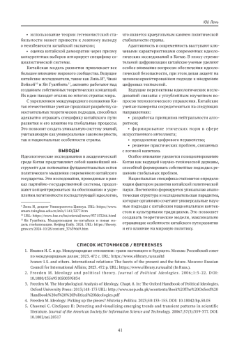1. Иванов И.С. и др. Международные отношения: грани настоящего и будущего. Москва: Российский совет по международным делам; 2023. 472 с. URL: https://www.elibrary.ru/uualtd