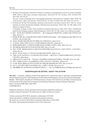 7. Ли Минхуэй, Лю Хун. Исследование перевода политического дискурса в Китае (2012-2021 гг.): визуализация на основе программы CiteSpace. Политическая лингвистика. 2022;3:108-119. URL: https://www.elibrary.ru/oaqnlo (In Russ.).