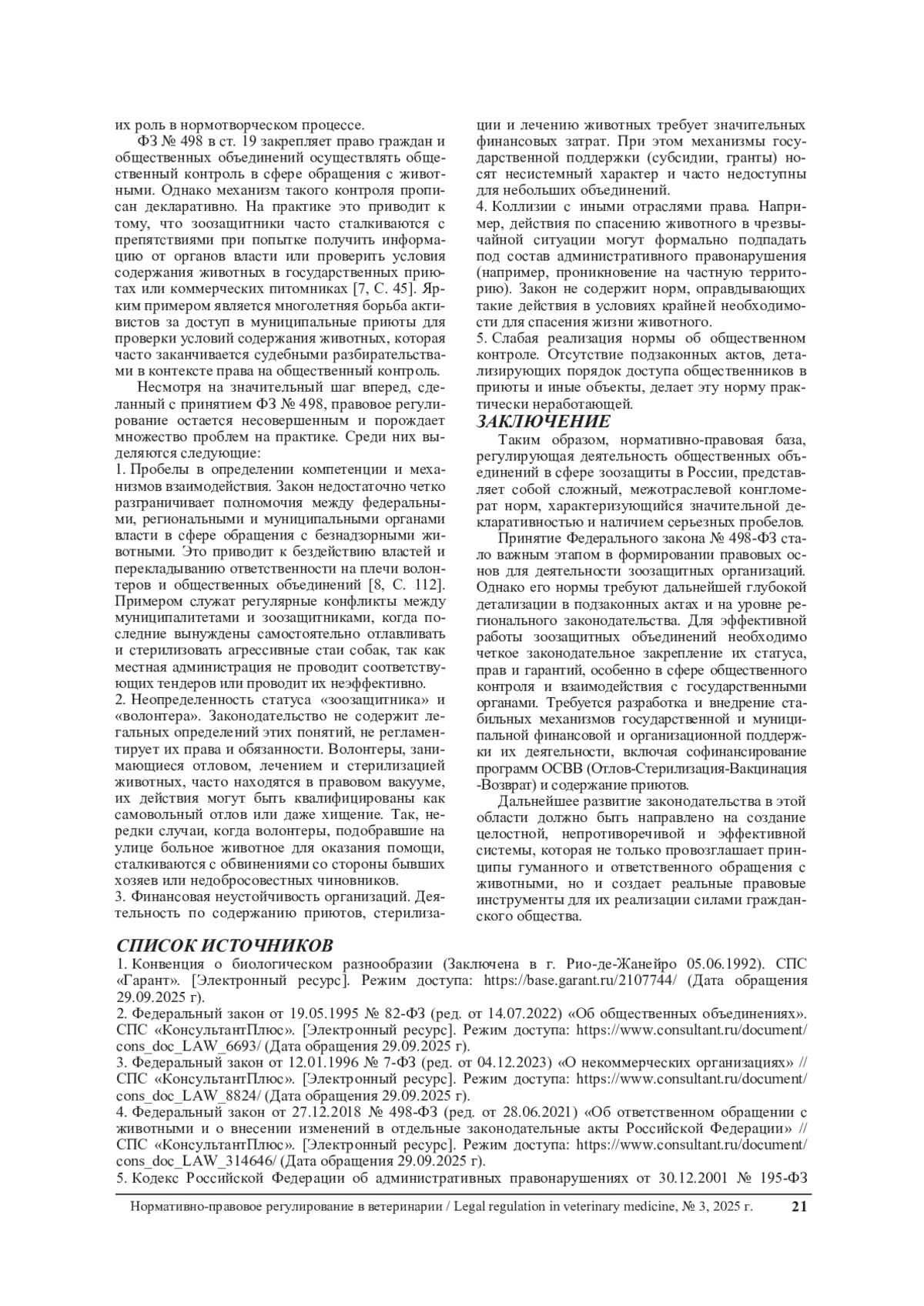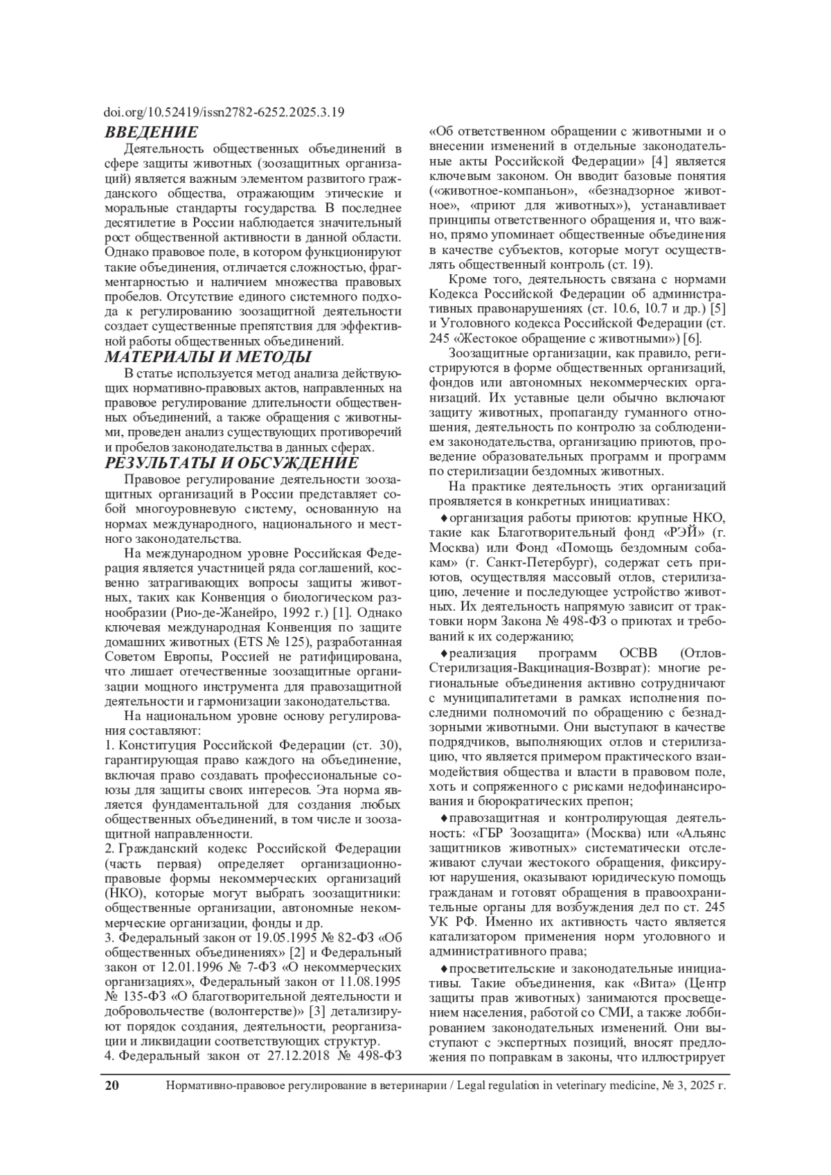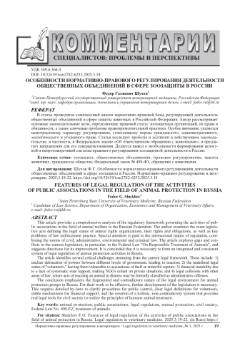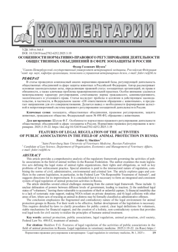 Статья: ОСОБЕННОСТИ НОРМАТИВНО-ПРАВОВОГО РЕГУЛИРОВАНИЯ ДЕЯТЕЛЬНОСТИ ОБЩЕСТВЕННЫХ ОБЪЕДИНЕНИЙ В СФЕРЕ ЗООЗАЩИТЫ В РОССИИ (2025)