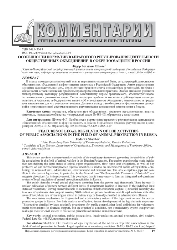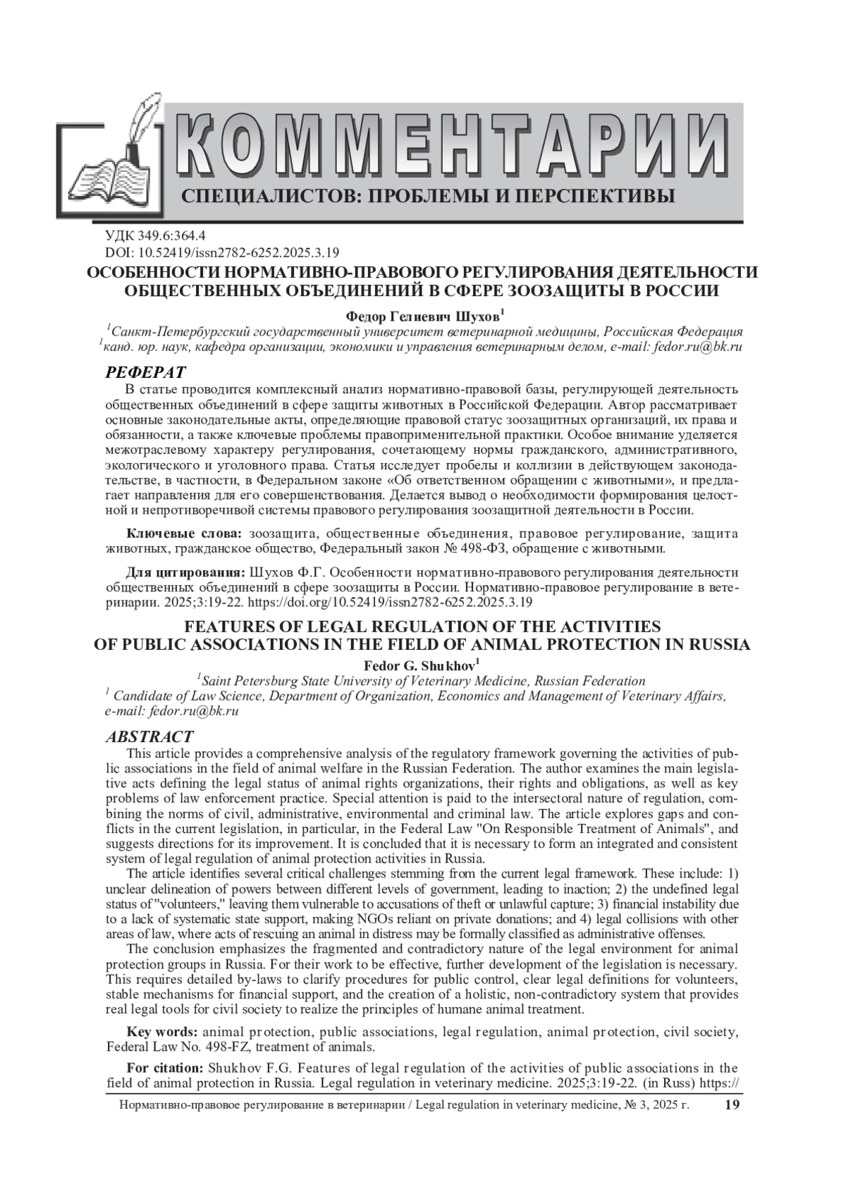 ШУХОВ Ф. Г. ОСОБЕННОСТИ НОРМАТИВНО-ПРАВОВОГО РЕГУЛИРОВАНИЯ ДЕЯТЕЛЬНОСТИ ОБЩЕСТВЕННЫХ ОБЪЕДИНЕНИЙ В СФЕРЕ ЗООЗАЩИТЫ В РОССИИ // НОРМАТИВНО-ПРАВОВОЕ РЕГУЛИРОВАНИЕ В ВЕТЕРИНАРИИ. 2025. № 3