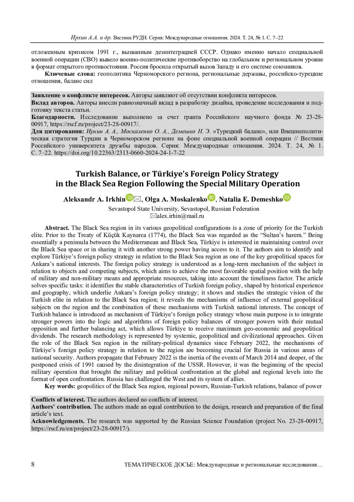 1. Аватков В. А., Гудев П. А. Геополитика российско-турецких отношений в Черноморском регионе // Вестник Российского университета дружбы народов. Серия: Политология. 2021. Т. 23, № 3. C. 348-363. DOI: 10.22363/2313-1438-2021-23-3-348-363 EDN: FDHWEO
