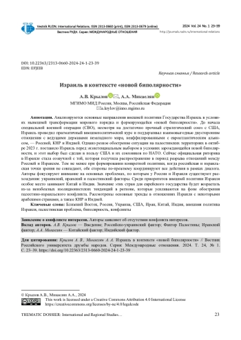 Анализируются основные направления внешней политики Государства Израиль в условиях нынешней трансформации мирового порядка и формирующейся «новой биполярности». До начала специальной военной операции (СВО), несмотря на достаточно прочный стратегический союз с США, Израиль проводил прагматичный внешнеполитический курс и поддерживал взаимовыгодные двусторонние отношения с ведущими державами незападного мира, неаффилированными с евроатлантическим альянсом, - Россией, КНР и Индией. Однако резкое обострение ситуации на палестинских территориях в октябре 2023 г. поставило Израиль перед экзистенциальным выбором в условиях зарождающейся новой биполярности, и этот выбор был сделан в пользу США и их союзников по НАТО. Сейчас официальная риторика в Израиле стала созвучной с той, которая получила распространение в период разрыва отношений между Россией и Израилем. Тем не менее при формировании конкретной политики, когда российская и израильская точки зрения не совпадают, обе стороны по-прежнему координируют все действия в рамках диалога. Авторы фокусируют внимание на основных проблемах, по которым у России и Израиля существуют расхождения: украинский, иранский и палестинский факторы. Среди приоритетов внешней политики Израиля особое место занимают Китай и Индия. Значение этих стран для еврейского государства будет возрастать из-за неизбежных изоляционистских тенденций в регионе, которые усиливаются на фоне обострения палестино-израильского конфликта. Рассмотрены основные тренды в отношениях Израиля с некоторыми арабскими странами, а также КНР и Индией.