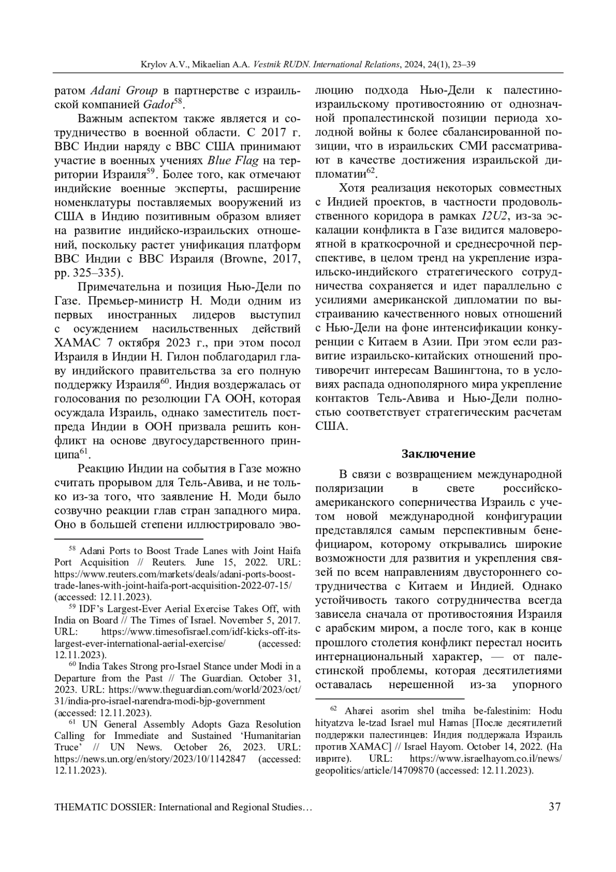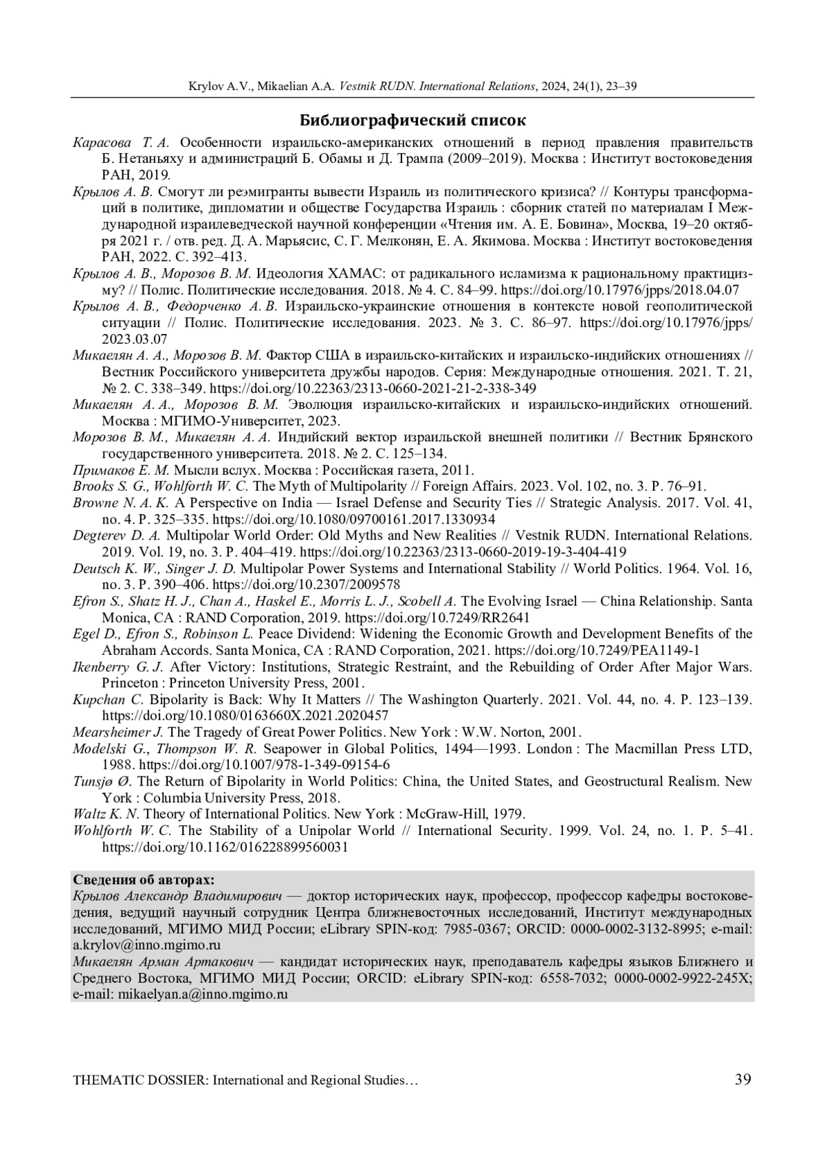 5. Микаелян А. А., Морозов В. М. Фактор США в израильско-китайских и израильско-индийских отношениях // Вестник Российского университета дружбы народов. Серия: Международные отношения. 2021. Т. 21, № 2. С. 338-349. DOI: 10.22363/2313-0660-2021-21-2-338-349 EDN: IVFFSH