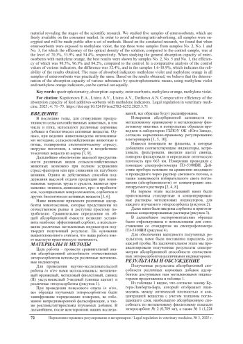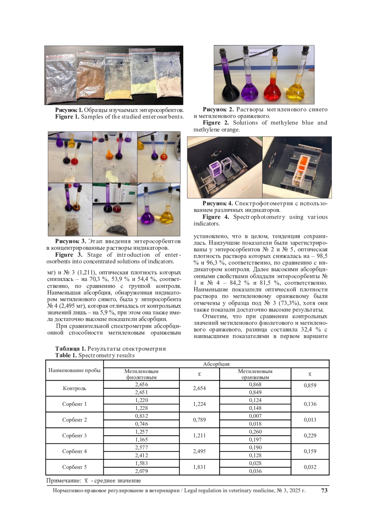 В настоящее время на рынке страны появляется достаточное количество новых кормовых добавок, которых производители заявляют в качестве энтеросорбентов. Наиболее доступным и менее трудоемким способом для установления общей абсорбционной емкости добавки является спектрофотометрия. Целью нашей работы явился сравнительный анализ абсорбционной способности отечественных энтеросорбентов при использовании различных метиленовых индикаторов. Научно-исследовательская работа проводилась на базе ГБПОУ ОК «Юго-Запад» согласно общепринятых методик. Для обеспечения валидности полученных результатов, нами была поставлена параллель для каждой пробы. В статье представлен обширный фотоматериал раскрывающий этапы проведения научного исследования. Нами было изучено пять образцов энтеросорбентов, которые в свободном доступе представлены на потребительском рынке. Во избежание рекламы/антирекламы все образцы нами были зашифрованы и после комплекса проведенных методик будут обнародованы. На основании проведенных исследований нами было установлено, что при воздействии на энтеросорбенты метиленовым фиолетовым, в тройке лидеров оказались образцы из проб № 2, № 1 и № 3, у которых эффективность оптической плотности раствора, по сравнению с контрольным образцом, была на уровне 70,3 %, 53,9 % и 54,4 %, соответственно. При изучении общей абсорбционной способности энтеросорбентов метиленовым оранжевым, наилучшие результаты показали образцы № 2, № 5 и № 1, эффективность которых составила 98,5 %, 96,3 % и 84,2 %, по сравнению с контролем. При сравнительном анализе контрольных значений различных индикаторов разность составила 32,4 %, а в образцах 1,6-18,9 %, что говорит о достоверности полученных результатов. Масса поглощенных индикаторов метиленового фиолетового и метиленового оранжевого во всех образцах энтеросорбентов была практически одинаковой. На основании полученных результатов считаем, что определение абсорбционной способности различных веществ спектрофотометрическим способом, при помощи индикаторов метиленового фиолетового и метиленового оранжевого, можно проводить в равной степени.