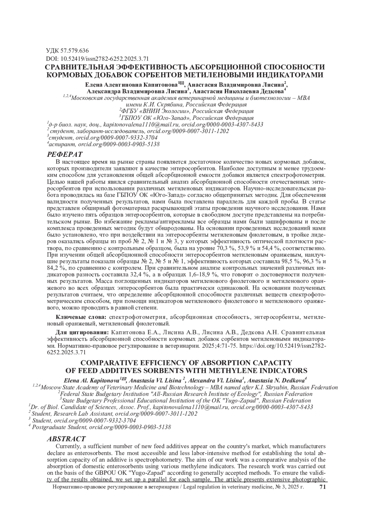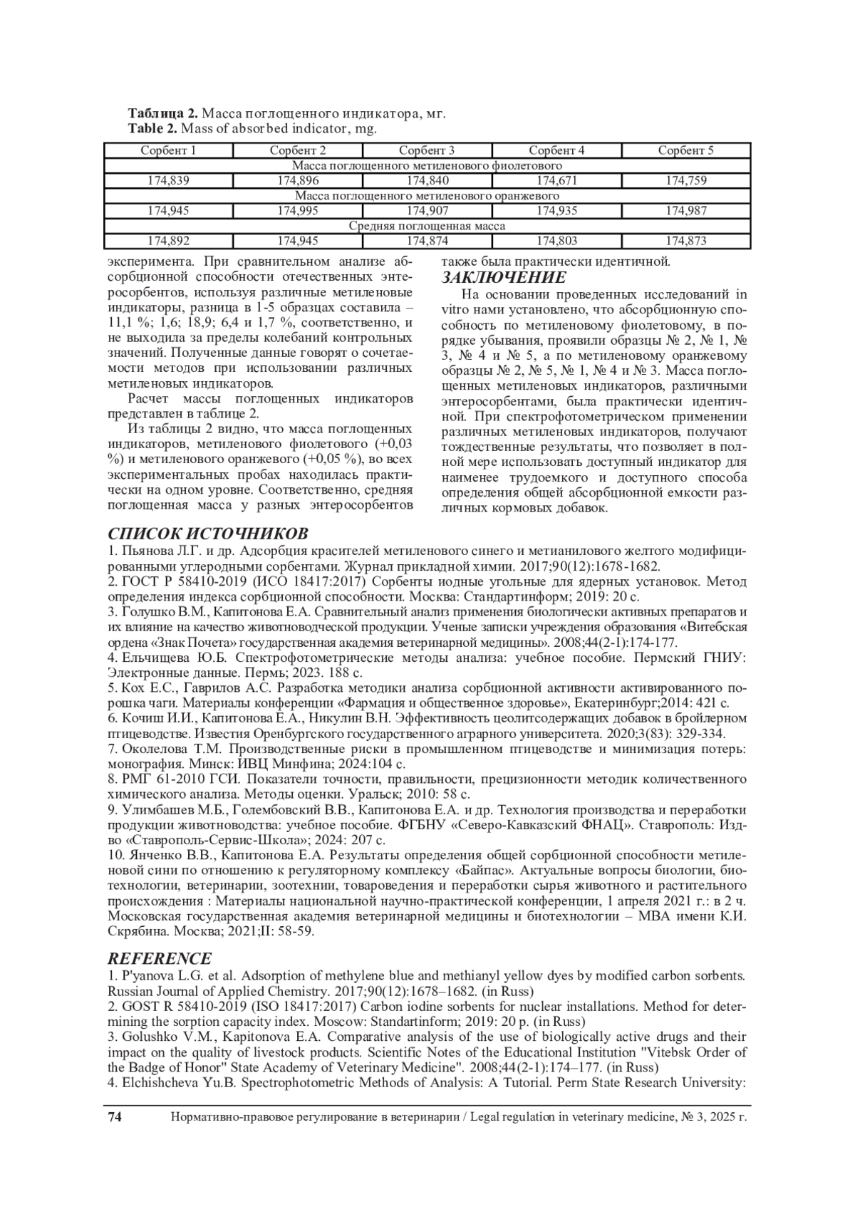 10. Янченко В.В., Капитонова Е.А. Результаты определения общей сорбционной способности метиленовой сини по отношению к регуляторному комплексу “Байпас”. Актуальные вопросы биологии, биотехнологии, ветеринарии, зоотехнии, товароведения и переработки сырья животного и растительного происхождения: Материалы национальной научно-практической конференции, 1 апреля 2021 г.: в 2 ч. Московская государственная академия ветеринарной медицины и биотехнологии - МВА имени К.И. Скрябина. Москва; 2021;II: 58-59.
