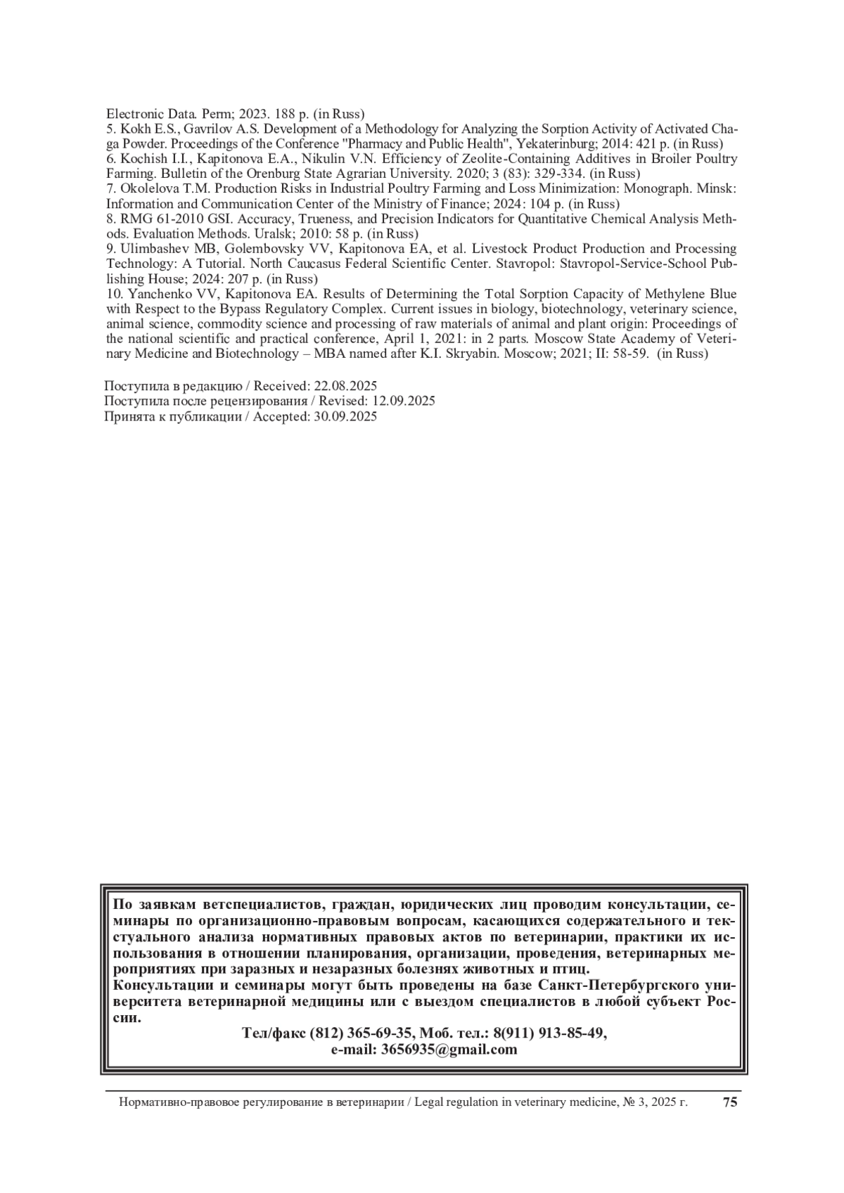 7. Околелова Т.М. Производственные риски в промышленном птицеводстве и минимизация потерь: монография. Минск: ИВЦ Минфина; 2024:104 с.