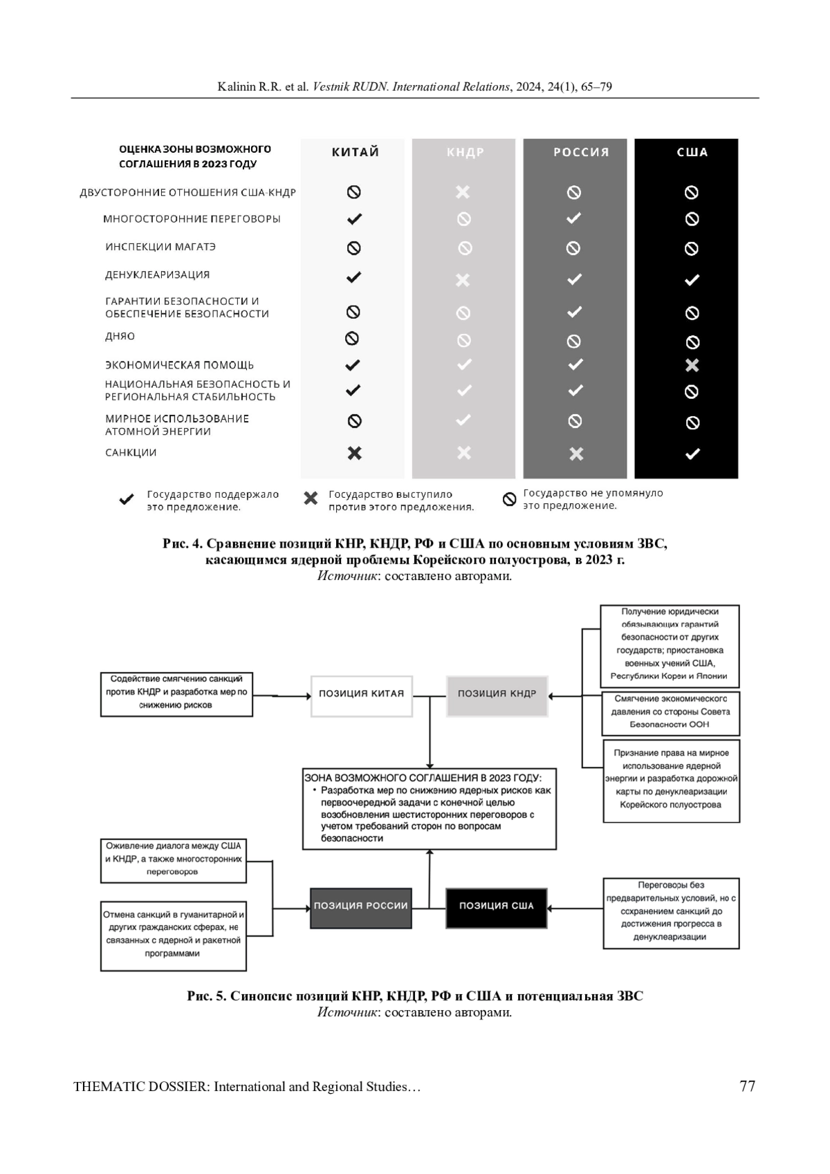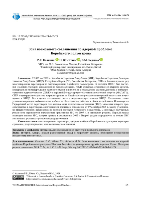 С 2003 по 2009 г. Китайская Народная Республика (КНР), Корейская Народная Демократическая Республика (КНДР), Республика Корея (РК), Российская Федерация, США и Япония провели ряд многосторонних переговоров по денуклеаризации Корейского полуострова. 19 сентября 2005 г. был достигнут «золотой стандарт» соглашений по денуклеаризации. КНДР обязалась отказаться от ядерного оружия, воздержаться от развертывания ядерного оружия и вернуться к соблюдению условий Договора о нераспространении ядерного оружия (ДНЯО) и гарантий Международного агентства по атомной энергии (МАГАТЭ). США подтвердили отсутствие ядерного оружия на Корейском полуострове и намерений напасть или вторгнуться в КНДР. Все стороны согласились оказать энергетическую помощь КНДР. Соглашение также установило принцип «обязательства в обмен на обязательства, действия в обмен на действия». Используется Гарвардский метод переговоров для анализа зоны возможного соглашения (ЗВС), элементы которого прослеживаются в переговорах, окончившихся принятием соглашения от 19 сентября 2005 г. между участниками Шестисторонних переговоров по ядерной проблеме Корейского полуострова. С помощью полученных результатов оцениваются перспективы применения ЗВС от 2005 г. в нынешних реалиях. Первый раздел посвящен анализу ЗВС, которая привела к соглашению 2005 г. Второй раздел сосредоточен на поиске ЗВС в нынешних условиях с учетом предыдущего опыта.