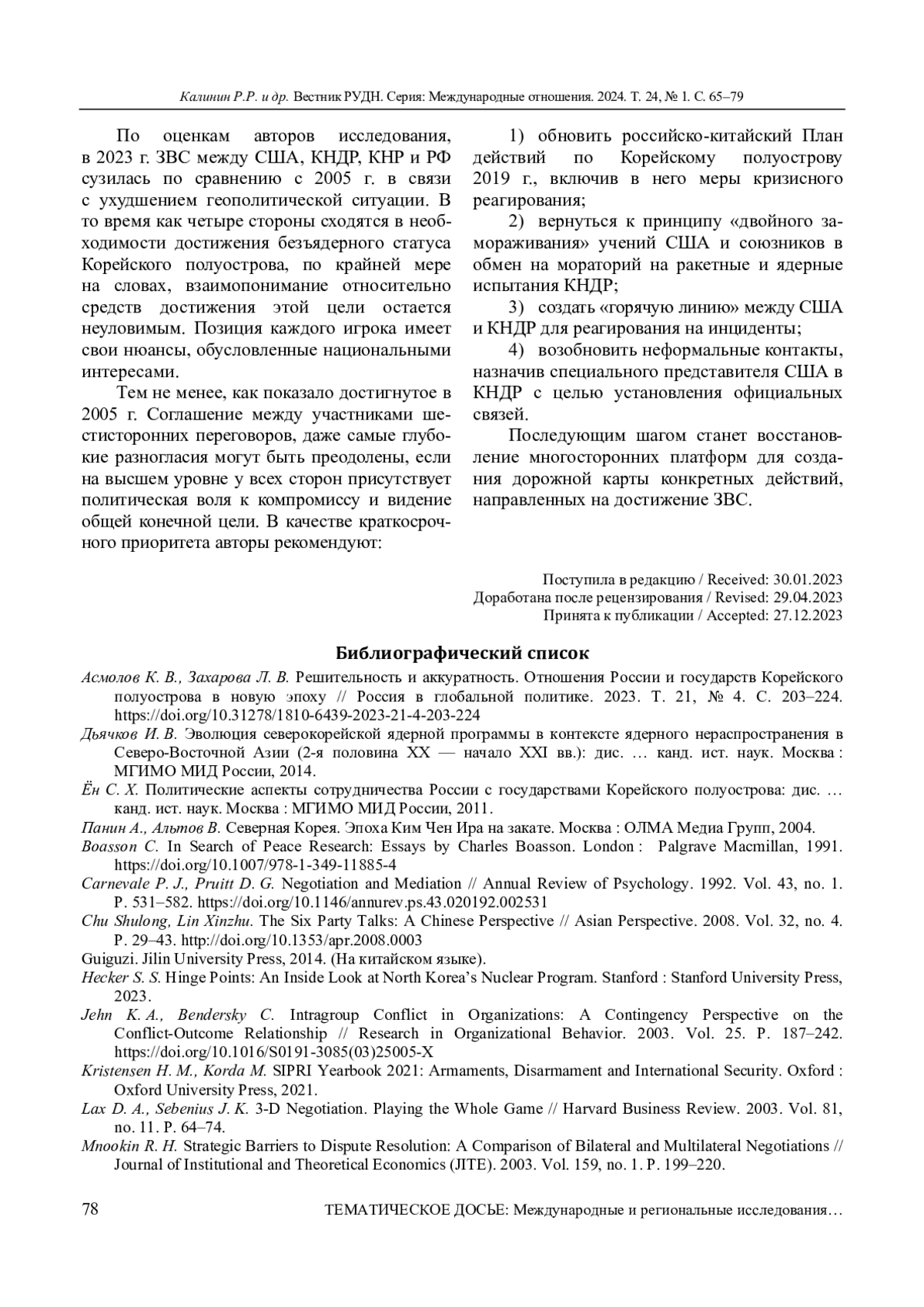 15. Park J. S. Inside Multilateralism: The Six-Party Talks // Washington Quarterly. 2005. Vol. 28, no. 4. P. 73-91. DOI: 10.1162/0163660054798726
