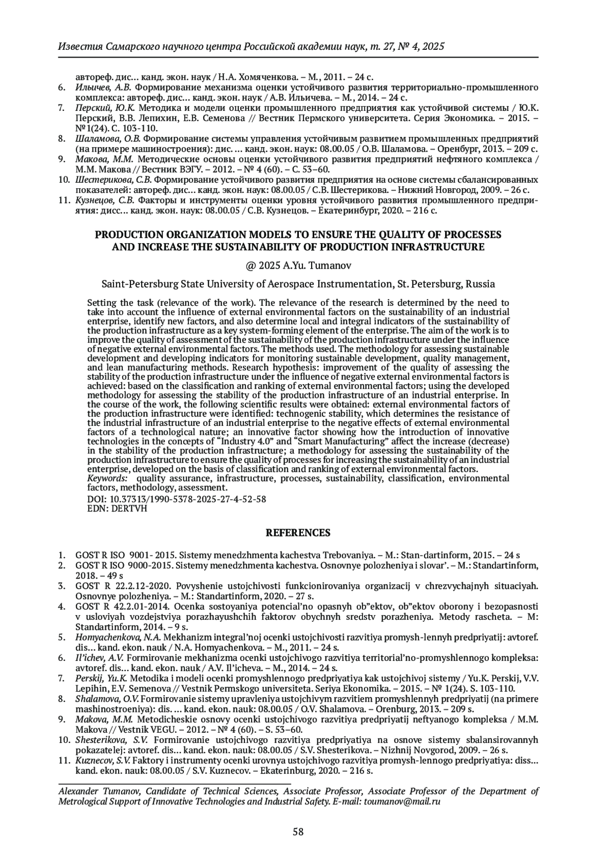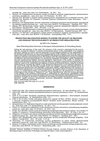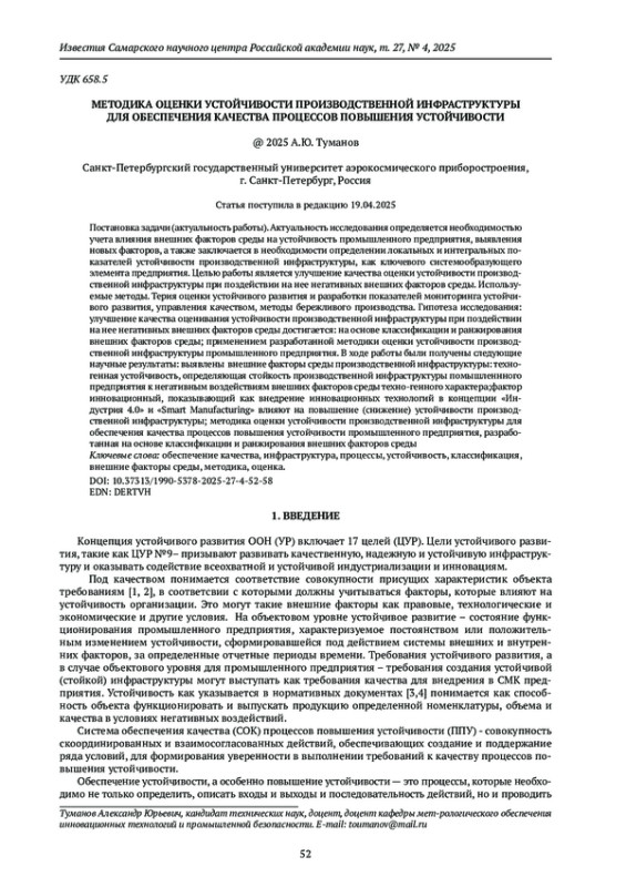 ТУМАНОВ А.Ю. МЕТОДИКА ОЦЕНКИ УСТОЙЧИВОСТИ ПРОИЗВОДСТВЕННОЙ ИНФРАСТРУКТУРЫ ДЛЯ ОБЕСПЕЧЕНИЯ КАЧЕСТВА ПРОЦЕССОВ ПОВЫШЕНИЯ УСТОЙЧИВОСТИ // ИЗВЕСТИЯ САМАРСКОГО НАУЧНОГО ЦЕНТРА РОССИЙСКОЙ АКАДЕМИИ НАУК. 2025. Т. 27 № 4 (126)