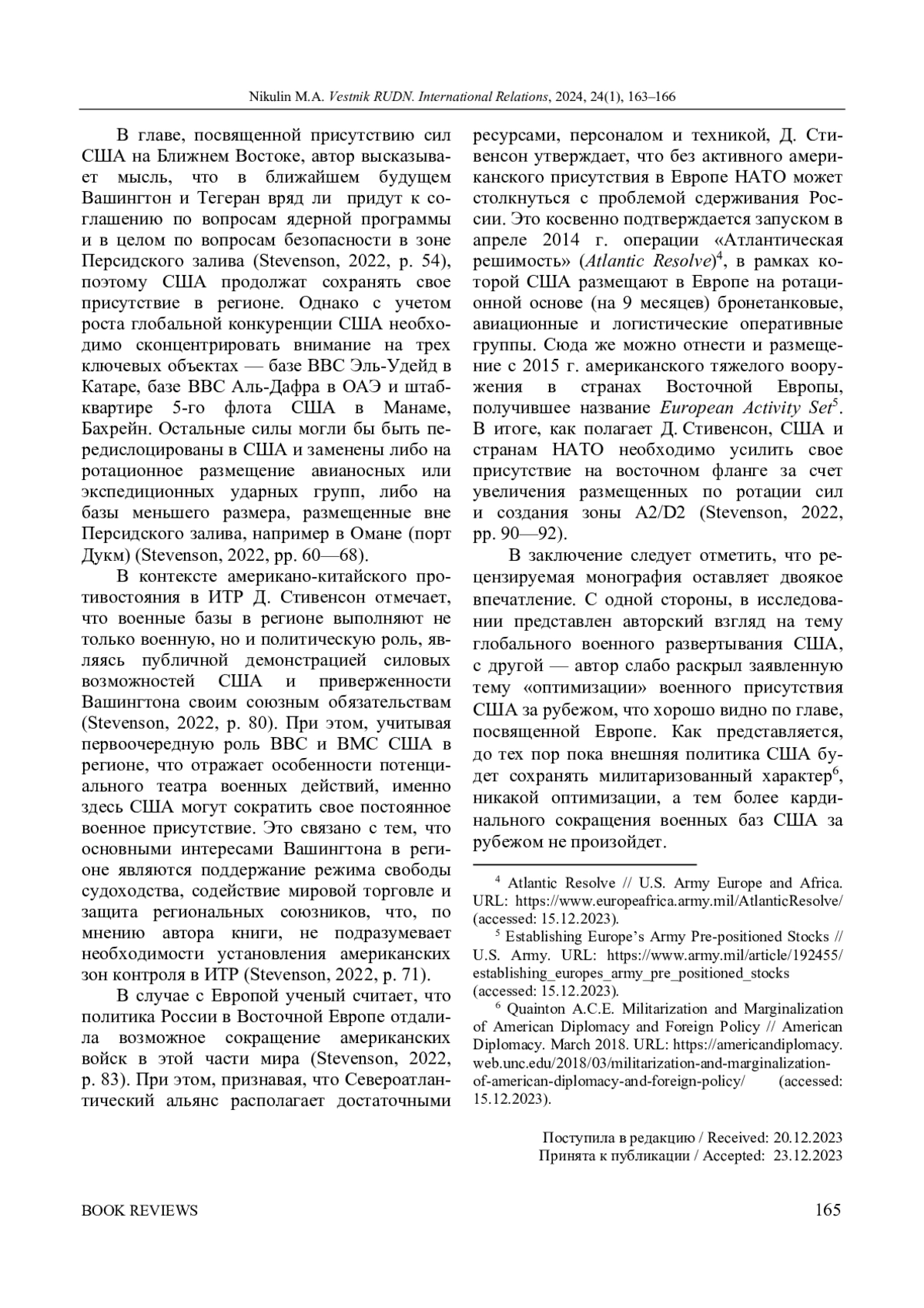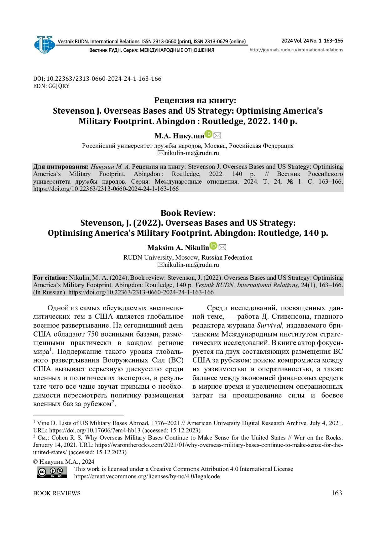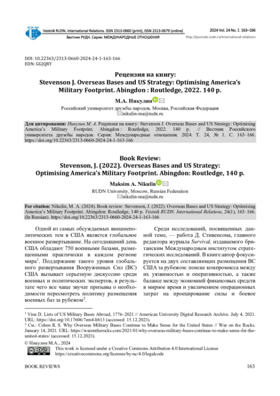Для цитирования: Никулин М. А. Рецензия на книгу: Stevenson J. Overseas Bases and US Strategy: Optimising America’s Military Footprint. Abingdon: Routledge, 2022. 140 p. // Вестник Российского университета дружбы народов. Серия: Международные отношения. 2024. Т. 24, № 1. С. 163–166. https://doi. org/10.22363/2313-0660-2024-24-1-163-166