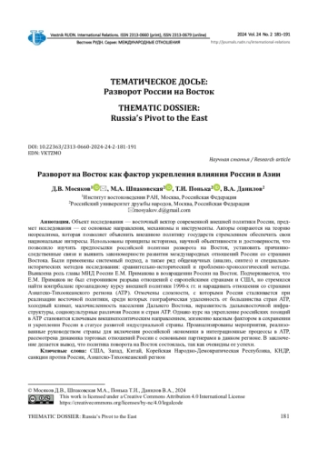 14. Торкунов А. В, Стрельцов Д. В. Российская политика поворота на Восток: проблемы и риски // Мировая экономика и международные отношения. 2023. Т. 67, № 4. С. 5-16. ;. DOI: 10.20542/0131-2227-2023-67-4-5-16 EDN: QBQAWC