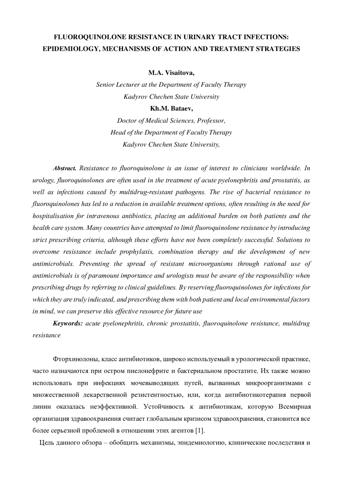 Устойчивость к фторхинолонам является проблемой, интересующей врачей во всем мире. В урологии фторхинолоны часто применяют при лечении острого пиелонефрита и простатита, а также инфекций, вызванных возбудителями с множественной лекарственной устойчивостью. Рост устойчивости бактерий к фторхинолонам привел к сокращению доступных вариантов лечения, что часто приводит к необходимости госпитализации для внутривенного введения антибиотиков, что создает дополнительную нагрузку как на пациентов, так и на систему здравоохранения. Многие страны пытались ограничить устойчивость к фторхинолонам, вводя строгие критерии назначения, хотя эти усилия не увенчались полным успехом. Решения по преодолению резистентности включают профилактику, комбинированную терапию и разработку новых противомикробных препаратов. Предотвращение распространения резистентных микроорганизмов путем рационального использования противомикробных препаратов имеет первостепенное значение, и урологи обязаны осознавать ответственность при назначении препаратов, обращаясь к клиническим рекомендациям. Оставляя фторхинолоны для инфекций, при которых они действительно показаны, и назначая их с учетом как особенностей пациента, так и местных факторов окружающей среды, мы можем сохранить этот эффективный ресурс для будущего использования.