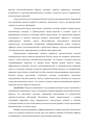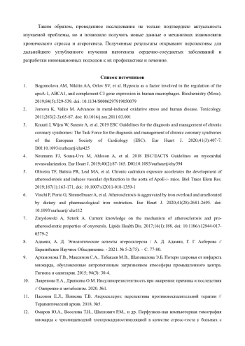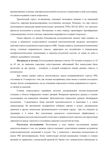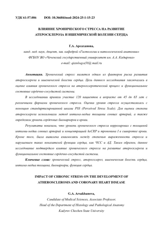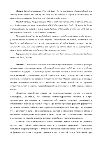 Хронический стресс является одним из факторов риска развития атеросклероза и ишемической болезни сердца. Цель данного исследования заключалась в оценке влияния хронического стресса на атеросклеротический процесс и функциональное состояние сердечно-сосудистой системы. В исследовании приняли участие 120 пациентов в возрасте от 45 до 65 лет с различными формами хронического стресса. Оценка уровня стресса осуществлялась с помощью стандартизированной шкалы PSS (Perceived Stress Scale). Для оценки степени атеросклероза использовали метод интима-медиа толщины сонных артерий, а также определяли уровень сердечных биомаркеров в крови. Результаты показали, что уровень хронического стресса коррелировал с толщиной интимы-медии сонных артерий и концентрацией hsCRP и тропонина I в сыворотке крови. Кроме того, была выявлена взаимосвязь между степенью выраженности стресса и нарушением таких показателей функции сердца, как ЧСС и АД. Таким образом, данное исследование подтвердило влияние хронического стресса на развитие атеросклероза и функциональное состояние сердечно-сосудистой системы.
