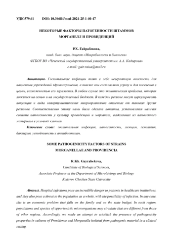 34. Gayrabekov R. Some features of the bacteria of the family enterobacteriaceae allocated from small cattle at different pathological processes //Gayrabekov R., Gayrabekova R., Molochaeva L. // Indian Journal of Forensic Medicine and Toxicology. 2020. Т. 14. № 4. - С. 7322-7327. EDN: HXZERF