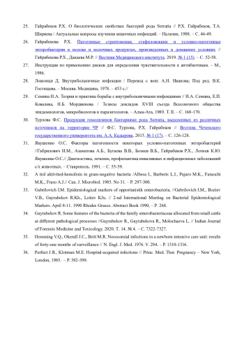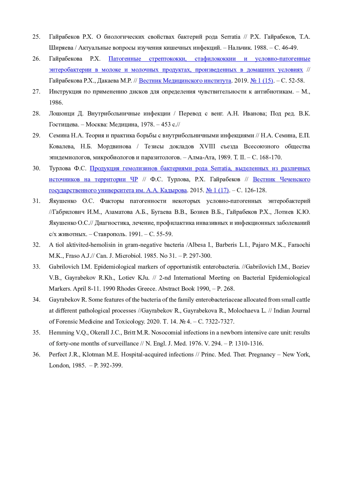 25. Гайрабеков Р.Х. О биологических свойствах бактерий рода Serratia // Р.Х. Гайрабеков, Т.А. Ширяева / Актуальные вопросы изучения кишечных инфекций. - Нальчик. 1988. - С. 46-49.