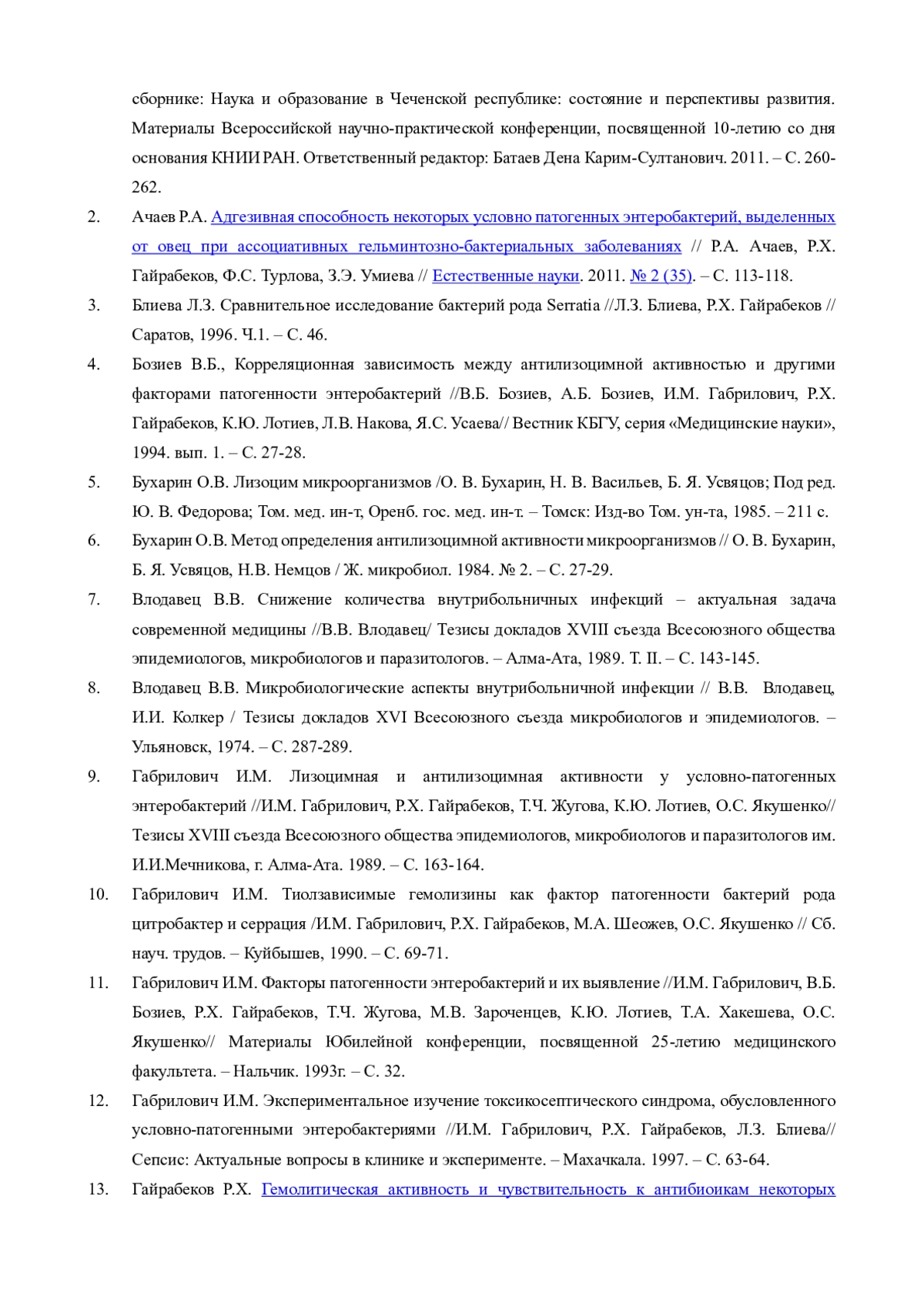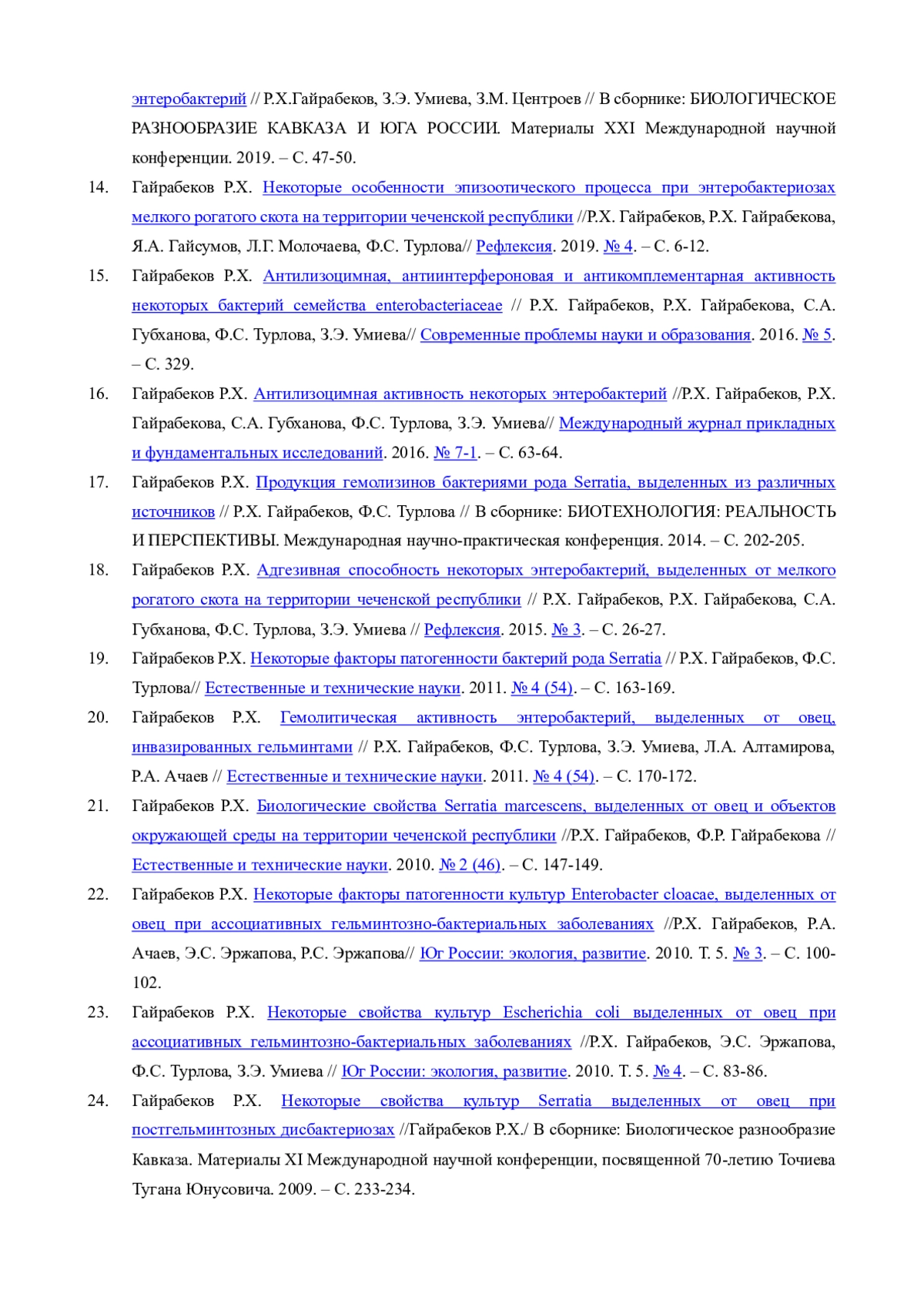 21. Гайрабеков Р.Х. Биологические свойства Serratia marcescens, выделенных от овец и объектов окружающей среды на территории чеченской республики //Р.Х. Гайрабеков, Ф.Р. Гайрабекова // Естественные и технические науки. 2010. № 2 (46). - С. 147-149.