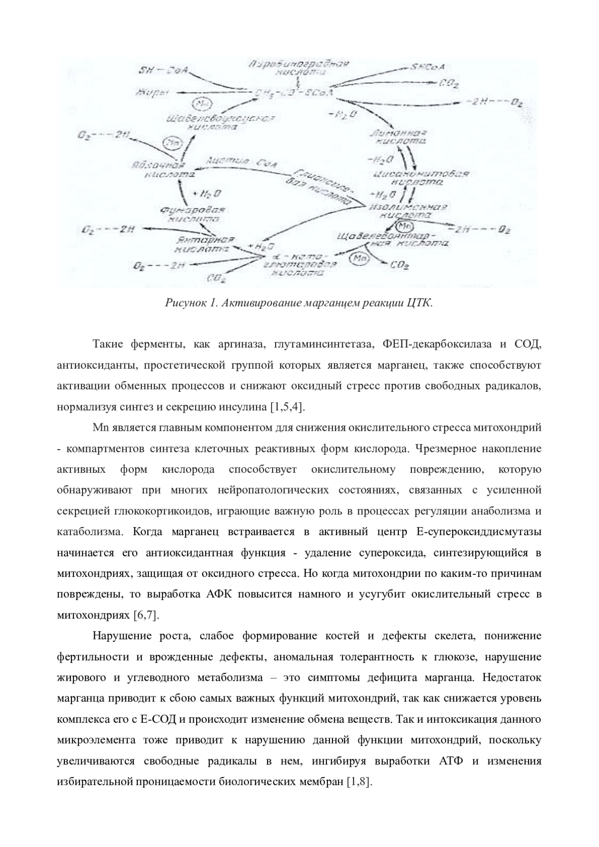 Mn является главным компонентом для снижения окислительного стресса митохондрий - компартментов синтеза клеточных реактивных форм кислорода. Чрезмерное накопление активных форм кислорода способствует окислительному повреждению, которую обнаруживают при многих нейропатологических состояниях, связанных с усиленной секрецией глюкокортикоидов, играющие важную роль в процессах регуляции анаболизма и катаболизма. Когда марганец встраивается в активный центр Е-супероксиддисмутазы начинается его антиоксидантная функция - удаление супероксида, синтезирующийся в митохондриях, защищая от оксидного стресса. Но когда митохондрии по каким-то причинам повреждены, то выработка АФК повысится намного и усугубит окислительный стресс в митохондриях [6,7].