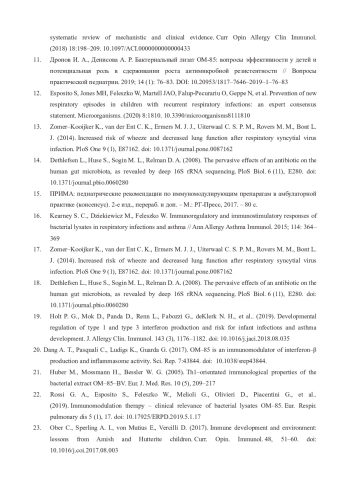 11. Дронов И. А., Денисова А. Р. Бактериальный лизат ОМ-85: вопросы эффективности у детей и потенциальная роль в сдерживании роста антимикробной резистентности // Вопросы практической педиатрии. 2019; 14 (1): 76-83. DOI: 10.20953/1817-7646-2019-1-76-83 EDN: QXGMFS
