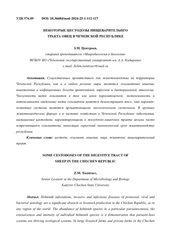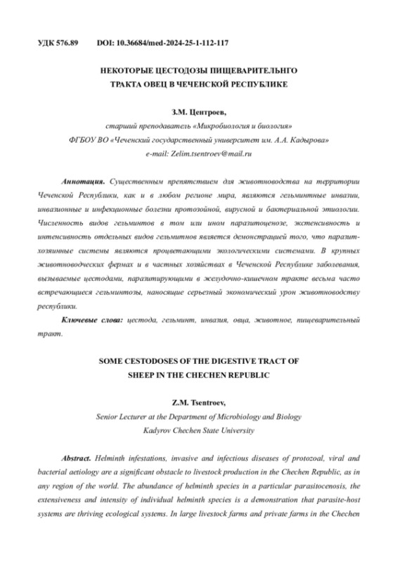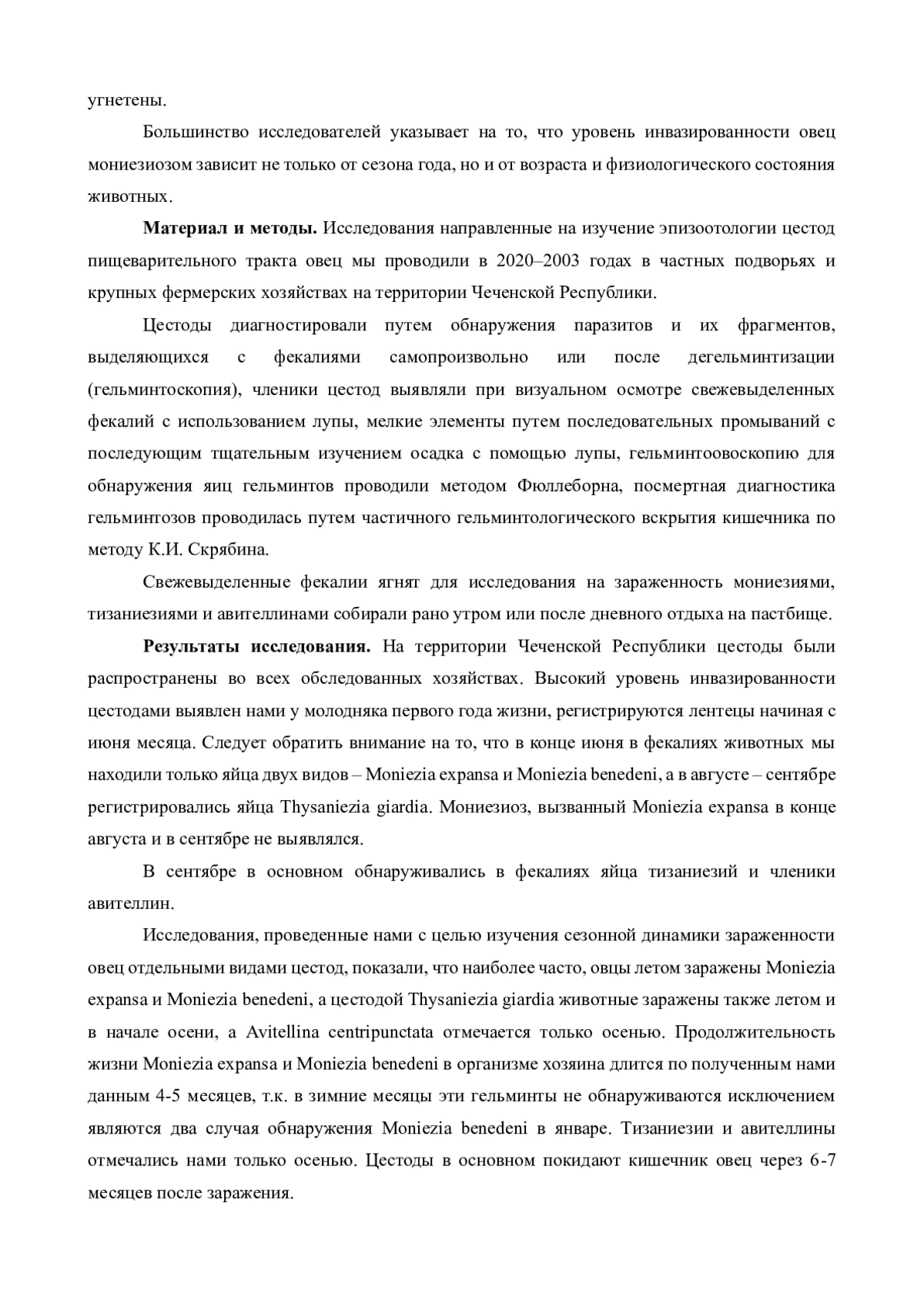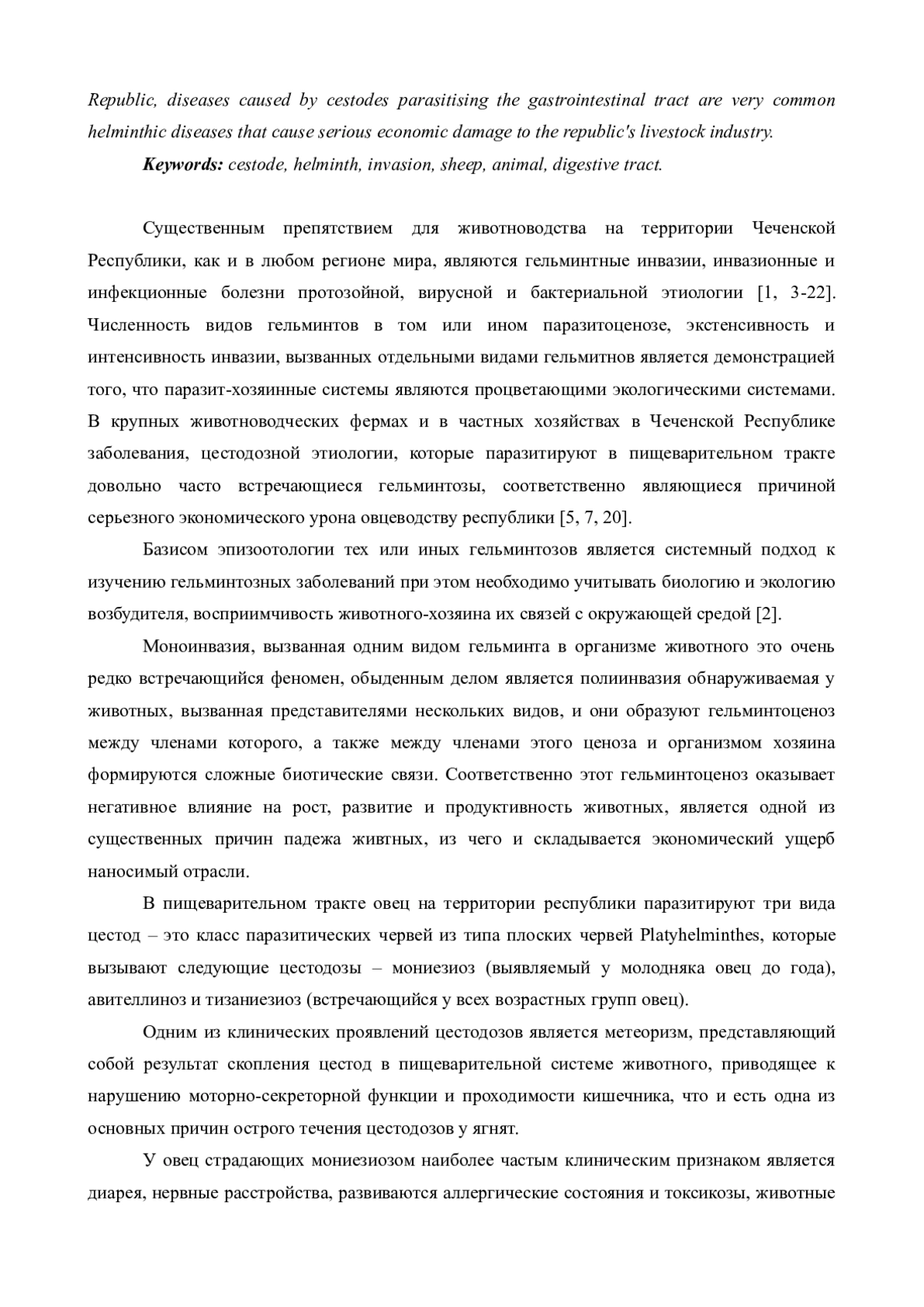 Существенным препятствием для животноводства на территории Чеченской Республики, как и в любом регионе мира, являются гельминтные инвазии, инвазионные и инфекционные болезни протозойной, вирусной и бактериальной этиологии [1, 3-22]. Численность видов гельминтов в том или ином паразитоценозе, экстенсивность и интенсивность инвазии, вызванных отдельными видами гельмитнов является демонстрацией того, что паразит-хозяинные системы являются процветающими экологическими системами. В крупных животноводческих фермах и в частных хозяйствах в Чеченской Республике заболевания, цестодозной этиологии, которые паразитируют в пищеварительном тракте довольно часто встречающиеся гельминтозы, соответственно являющиеся причиной серьезного экономического урона овцеводству республики [5, 7, 20].