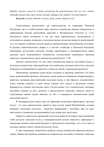 Существенным препятствием для животноводства на территории Чеченской Республики, как и в любом регионе мира, являются гельминтные инвазии, инвазионные и инфекционные болезни протозойной, вирусной и бактериальной этиологии. Численность видов гельминтов в том или ином паразитоценозе, экстенсивность и интенсивность отдельных видов гельмитнов является демонстрацией того, что паразит-хозяинные системы являются процветающими экологическими системами. В крупных животноводческих фермах и в частных хозяйствах в Чеченской Республике заболевания, вызываемые цестодами, паразитирующими в желудочно-кишечном тракте весьма часто встречающиеся гельминтозы, наносящие серьезный экономический урон животноводству республики.
