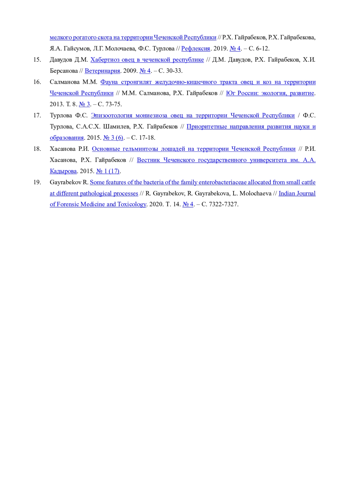 17. Гайрабеков Р.Х. Некоторые особенности эпизоотического процесса при энтеробактериозах мелкого рогатого скота на территории Чеченской Республики // Р.Х. Гайрабеков, Р.Х. Гайрабекова, Я.А. Гайсумов, Л.Г. Молочаева, Ф.С. Турлова // Рефлексия. 2019. № 4. - С. 6-12. EDN: RSDTGW