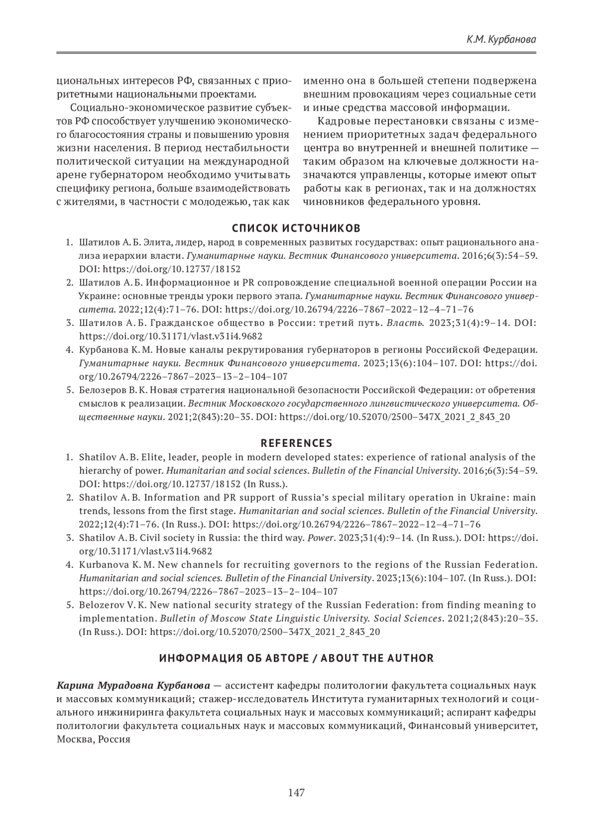 В настоящее время в процессе формирования политической элиты прослеживается следующая тенденция: отбор кандидатов производится из руководителей субъектов Российской Федерации. При успешном выполнении своих обязанностей на должностях губернаторов кандидаты могут быть назначены на более высокие должности в федеральный центр и продолжать продвижение по карьерной лестнице. В статье проводится анализ кадровых изменений политической элиты РФ после выборов президента в 2024 г., прослеживается характер перестановок и их влияние на состав губернаторского корпуса и Правительства РФ.
