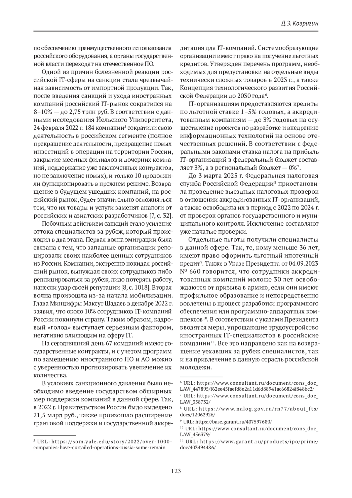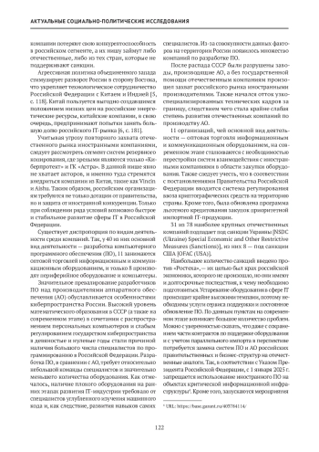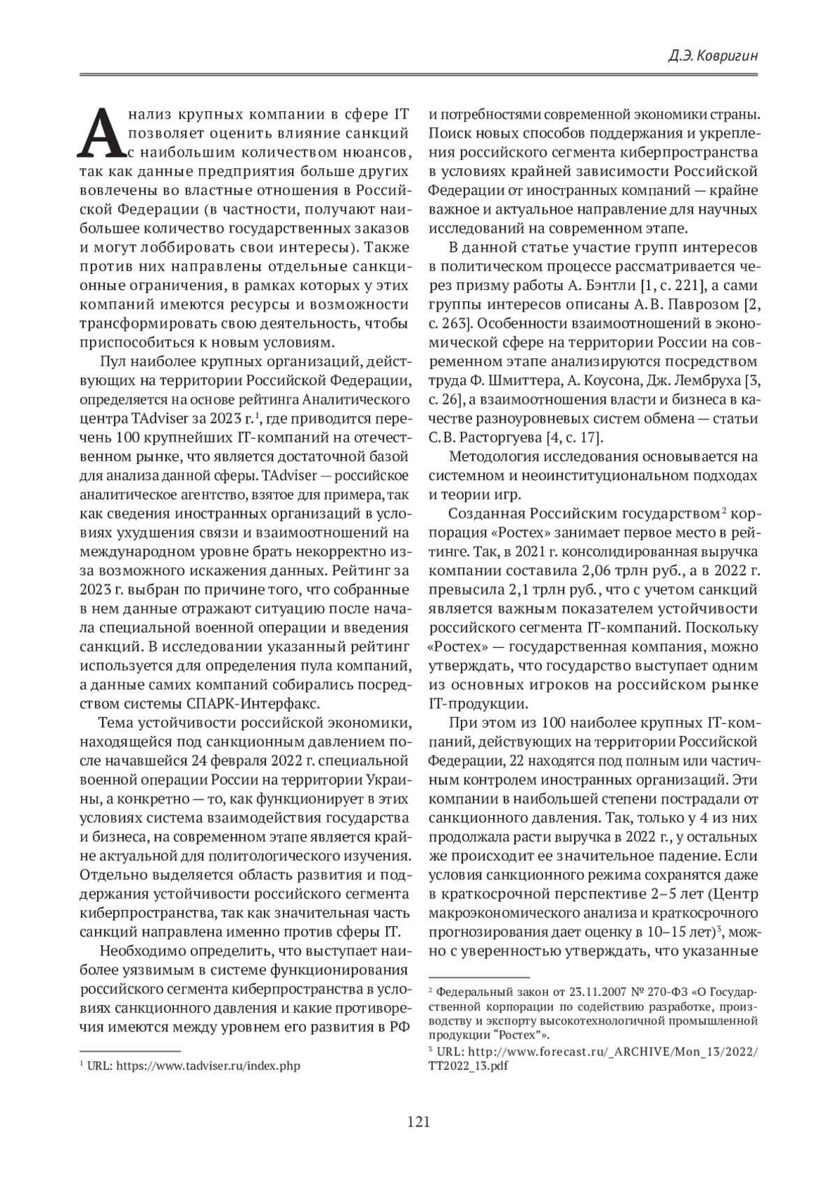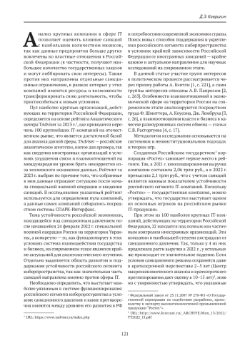 Целью данной статьи является изучение состояния наиболее крупных отечественных IT-компаний в условиях санкций. Автором рассмотрены топ-100 компаний из рейтинга TAdviser за 2023 г. Выявлены диспропорции между производителями аппаратного обеспечения (АО) и программного обеспечения (ПО). Рассмотрены общие проблемы экономики, вызванные санкциями, а также то, как государство стремится их нивелировать посредством дотаций и налоговых послаблений для компаний и сотрудников. На основе полученных данных проведен SWOT-анализ IT-сферы экономики Российской Федерации. Выявлено, что санкции наиболее сильно ударили именно по иностранным компаниям, действующим на российском рынке, что дает отечественным разработчикам возможности для активного роста. Повышенное внимание к отечественным IT-компаниям также связано с необходимостью замены иностранного оборудования и программ, используемых на современном этапе органами государственной власти и системообразующими предприятиями Российской Федерации. Данные факторы выступают причиной повышения активности взаимодействия органов государственной власти нашей страны и IT-предприятий.