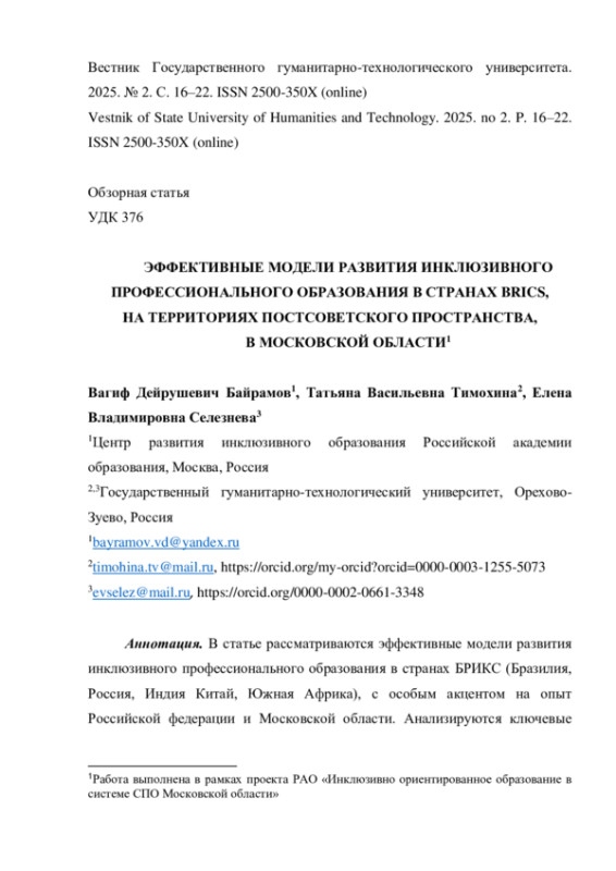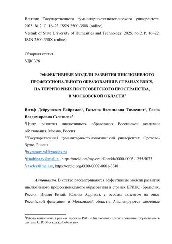 В статье рассматриваются эффективные модели развития инклюзивного профессионального образования в странах БРИКС (Бразилия, Россия, Индия Китай, Южная Африка), с особым акцентом на опыт Российской федерации и Московской области. Анализируются ключевые стратегии, нормативно-правовые основы, инфраструктурные и методические решения, направленные на обеспечение доступности профессионального образования для лиц с ограниченными возможностями здоровья и особыми образовательными потребностями.