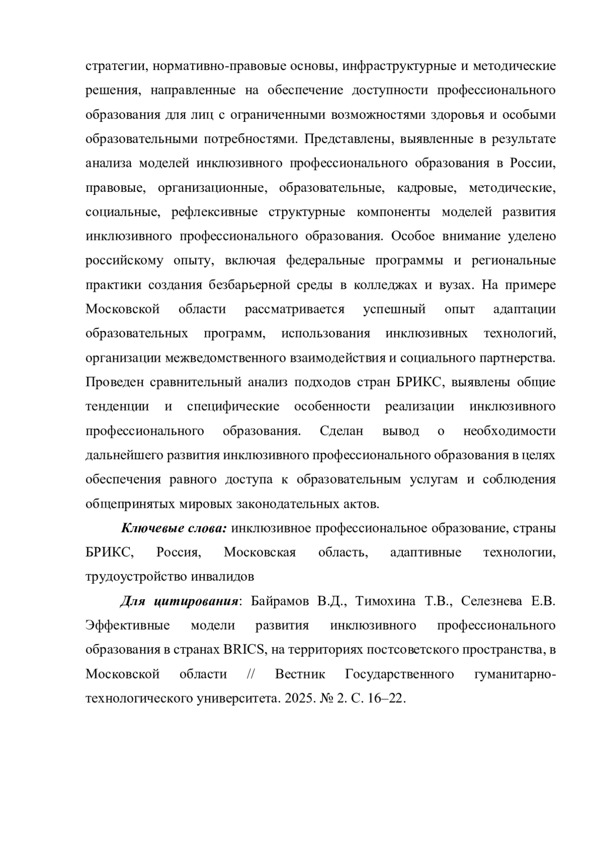 Проведен сравнительный анализ подходов стран БРИКС, выявлены общие тенденции и специфические особенности реализации инклюзивного профессионального образования.