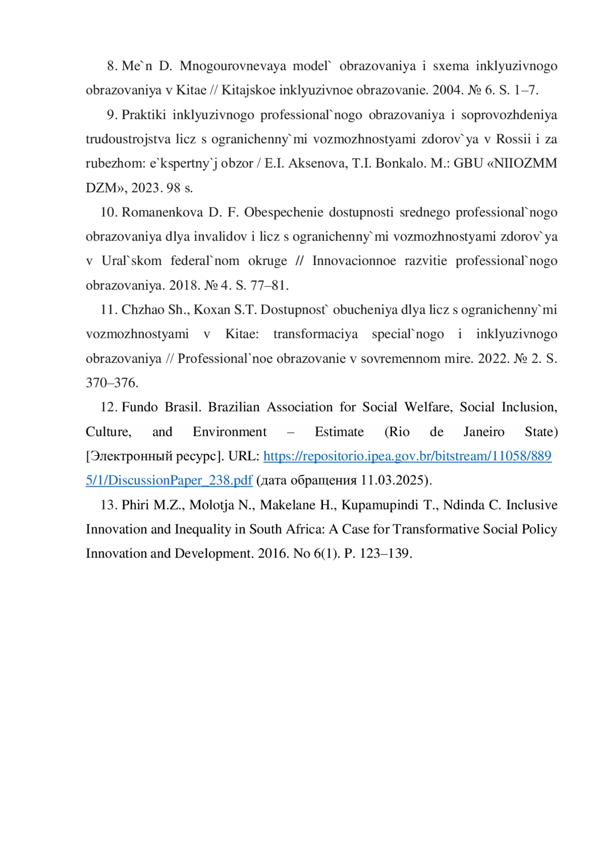 1. Бахтуридзе З. З., Васильева Н. А. Роль концепции инклюзивности в стратегиях развития стран БРИКС [Электронный ресурс]. URL: https://latamerica-journal.ru/s0044748x0023815-5-1/(дата обращения 18.02.2025).