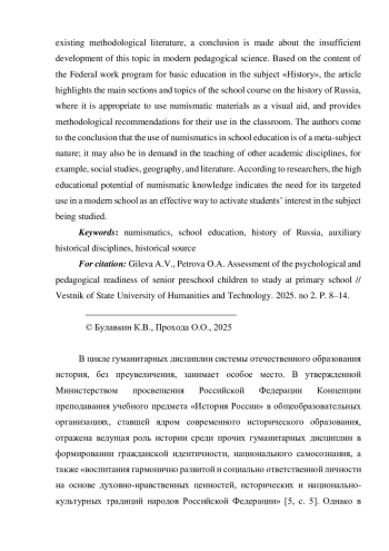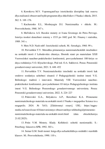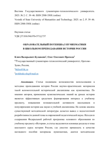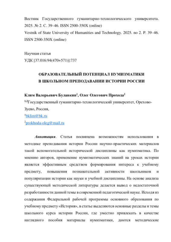 12. Покровский Г.А., Белякова А.П., Бережной К.А. Применение нумизматического материала на уроках истории / Наука в мегаполисе Science in a megapolis. 2024. № 7(63). [Электронный ресурс]. URL: https://mgpu-media.ru/issues/issue-63/innovatsionnye-obrazovatelnye-tekhnologii/primenenie-numizmaticheskogo-materiala-na-urokakh-istorii.html(датаобращения21.02.2025). EDN: FTDZGG