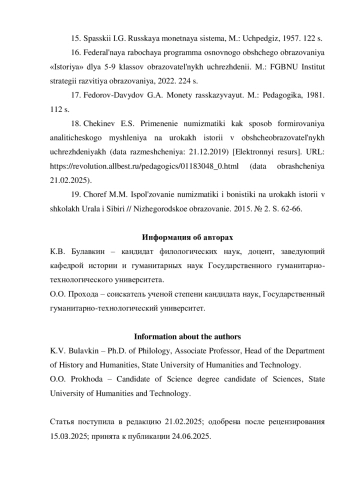 18. Чекинёв Э.С. Применение нумизматики как способ формирования аналитического мышления на уроках истории в общеобразовательных учреждениях (дата размещения: 21.12.2019) [Электронный ресурс]. URL: https://revolution.allbest.ru/pedagogics/01183048_0.html(датаобращения21.02.2025).