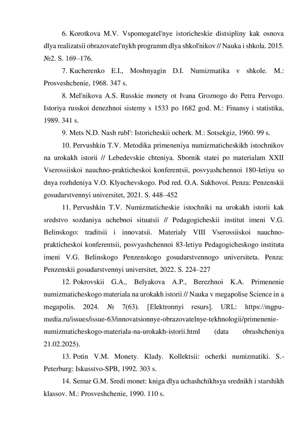 10. Первушкин Т.В. Методика применения нумизматических источников на уроках истории // Лебедевские чтения. Сборник статей по материалам XXII Всероссийской научно-практической конференции, посвященной 180-летию со дня рождения В.О. Ключевского / под ред. О.А. Суховой. Пенза: Пензенский государственный университет, 2021. С. 448-452. EDN: QJPEMI