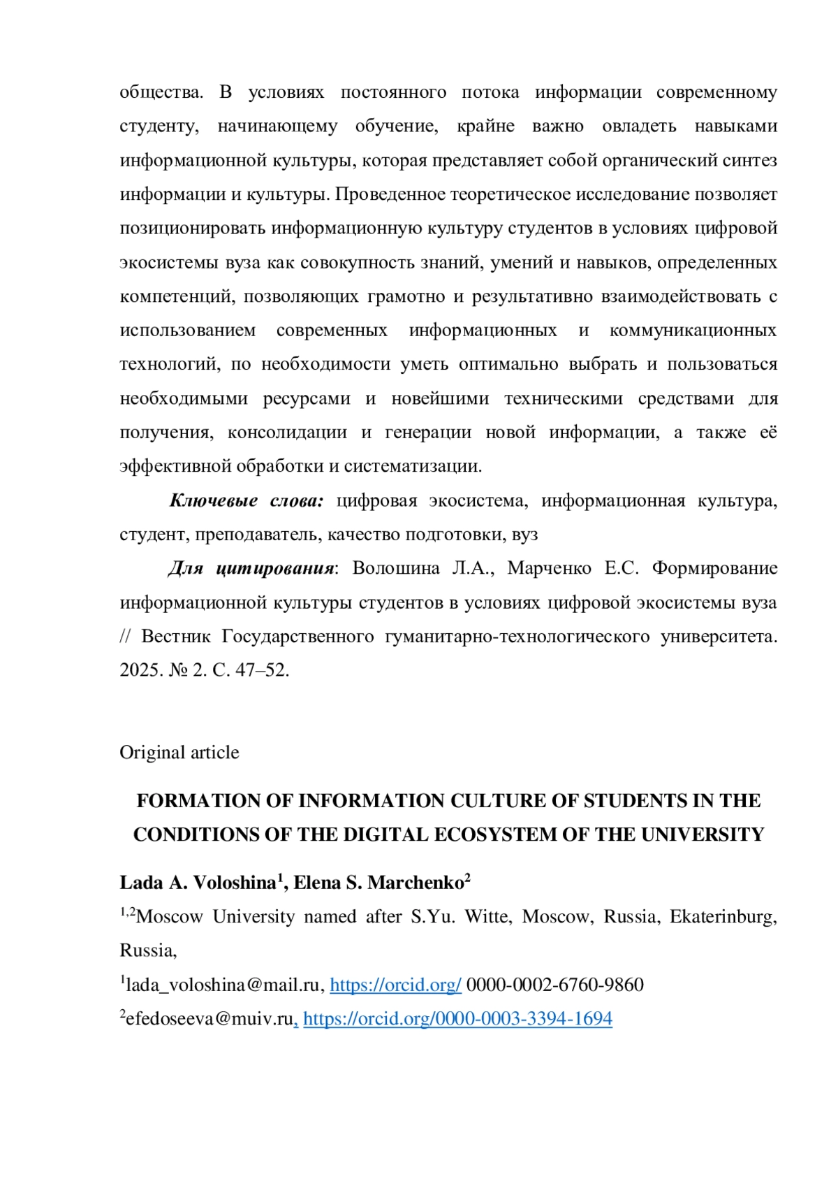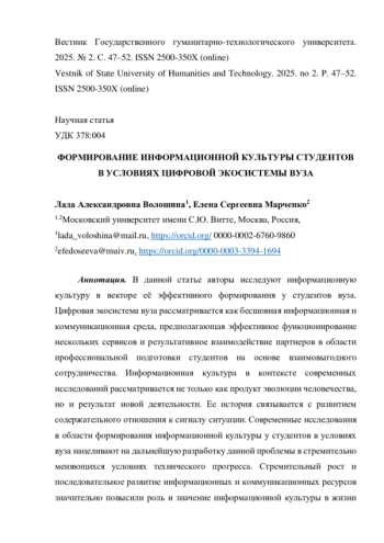 В условиях постоянного потока информации современному студенту, начинающему обучение, крайне важно овладеть навыками информационной культуры, которая представляет собой органический синтез информации и культуры. Проведенное теоретическое исследование позволяет позиционировать информационную культуру студентов в условиях цифровой экосистемы вуза как совокупность знаний, умений и навыков, определенных компетенций, позволяющих грамотно и результативно взаимодействовать с использованием современных информационных и коммуникационных технологий, по необходимости уметь оптимально выбрать и пользоваться необходимыми ресурсами и новейшими техническими средствами для получения, консолидации и генерации новой информации, а также её эффективной обработки и систематизации.