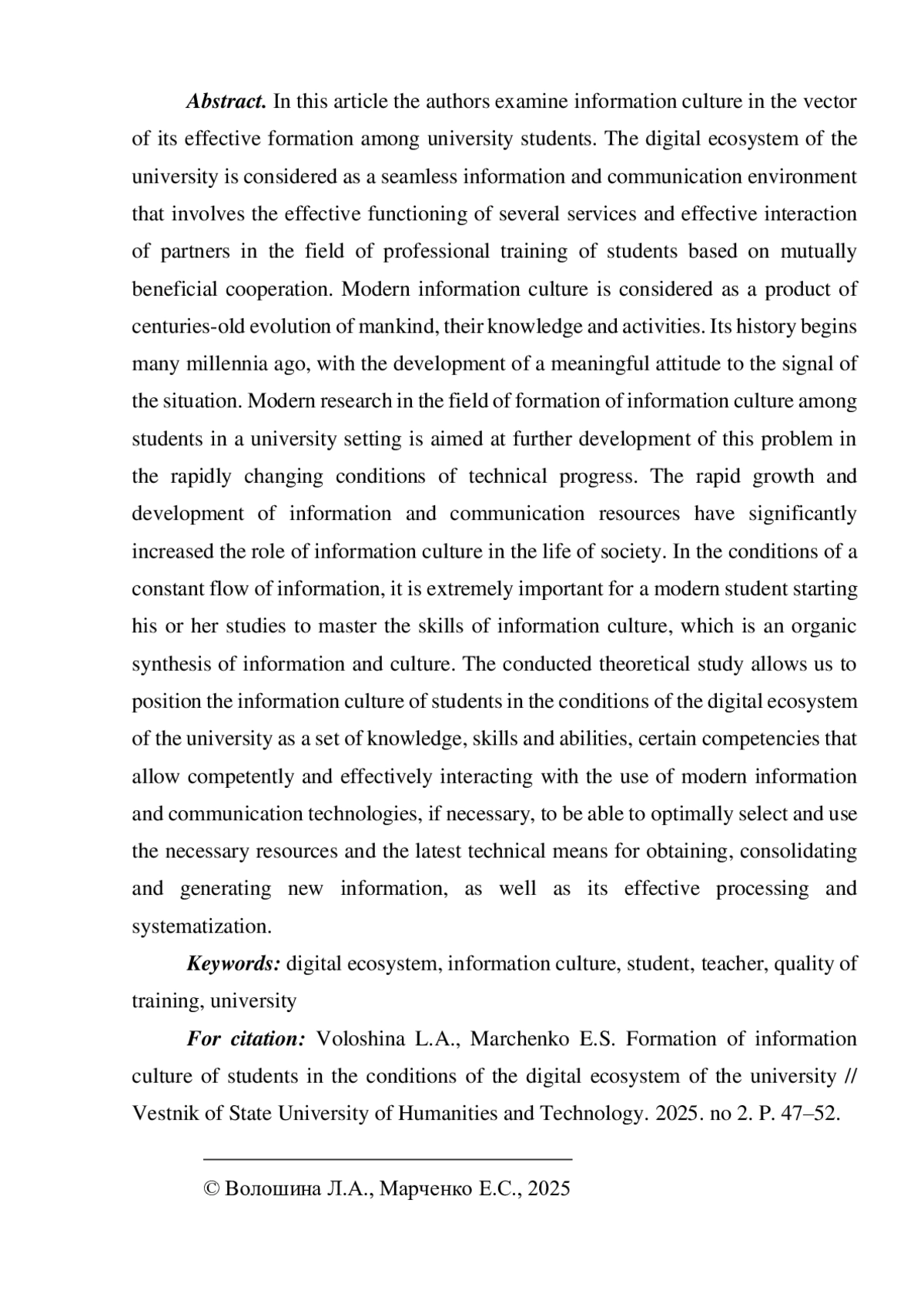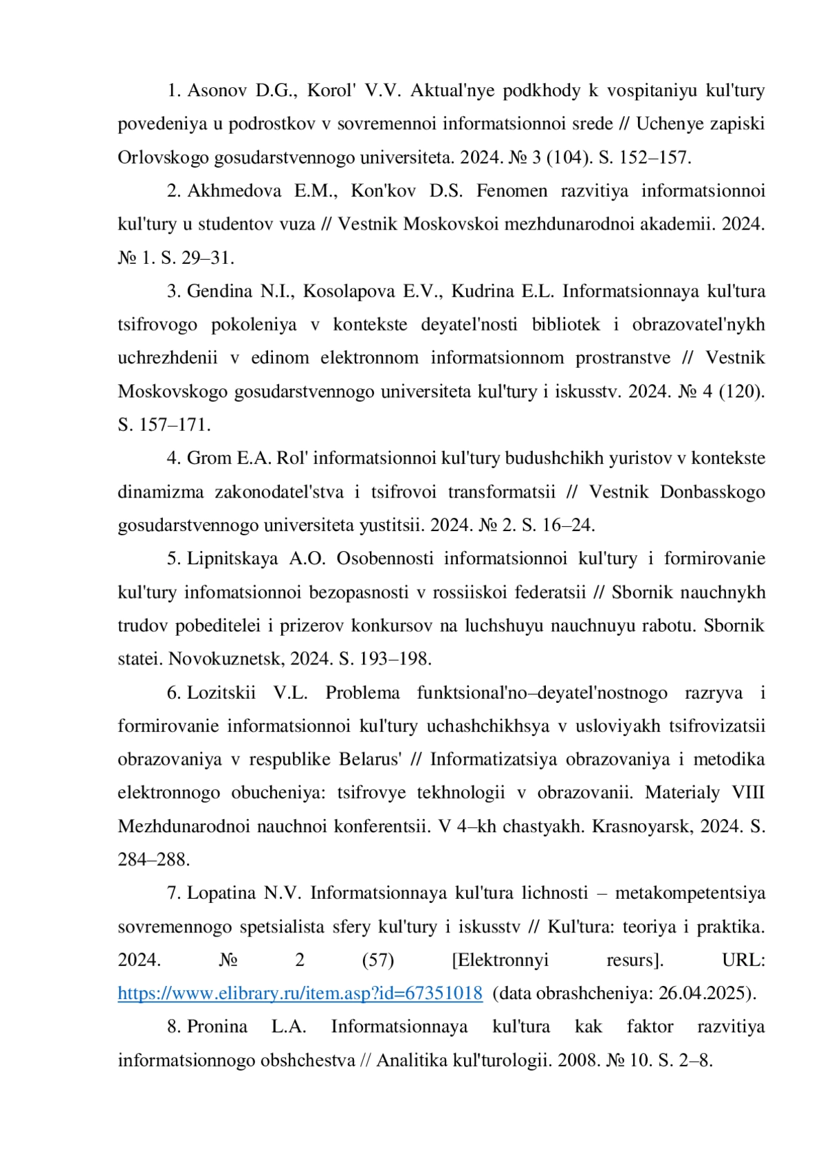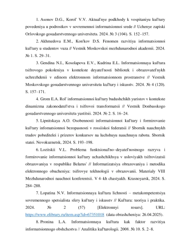 7. Лопатина Н.В. Информационная культура личности - метакомпетенция современного специалиста сферы культуры и искусств / Культура: теория и практика. 2024. № 2 (57) [Электронный ресурс]. URL: item.asp?id=67351018(датаобращения:26.04.2025). EDN: VFDKXK