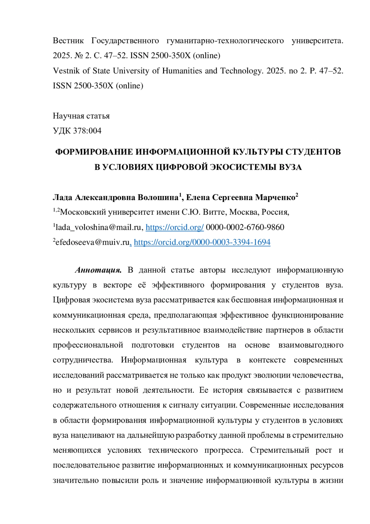 В данной статье авторы исследуют информационную культуру в векторе её эффективного формирования у студентов вуза. Цифровая экосистема вуза рассматривается как бесшовная информационная и коммуникационная среда, предполагающая эффективное функционирование нескольких сервисов и результативное взаимодействие партнеров в области профессиональной подготовки студентов на основе взаимовыгодного сотрудничества. Информационная культура в контексте современных исследований рассматривается не только как продукт эволюции человечества, но и результат новой деятельности. Ее история связывается с развитием содержательного отношения к сигналу ситуации. Современные исследования в области формирования информационной культуры у студентов в условиях вуза нацеливают на дальнейшую разработку данной проблемы в стремительно меняющихся условиях технического прогресса. Стремительный рост и последовательное развитие информационных и коммуникационных ресурсов значительно повысили роль и значение информационной культуры в жизни общества.