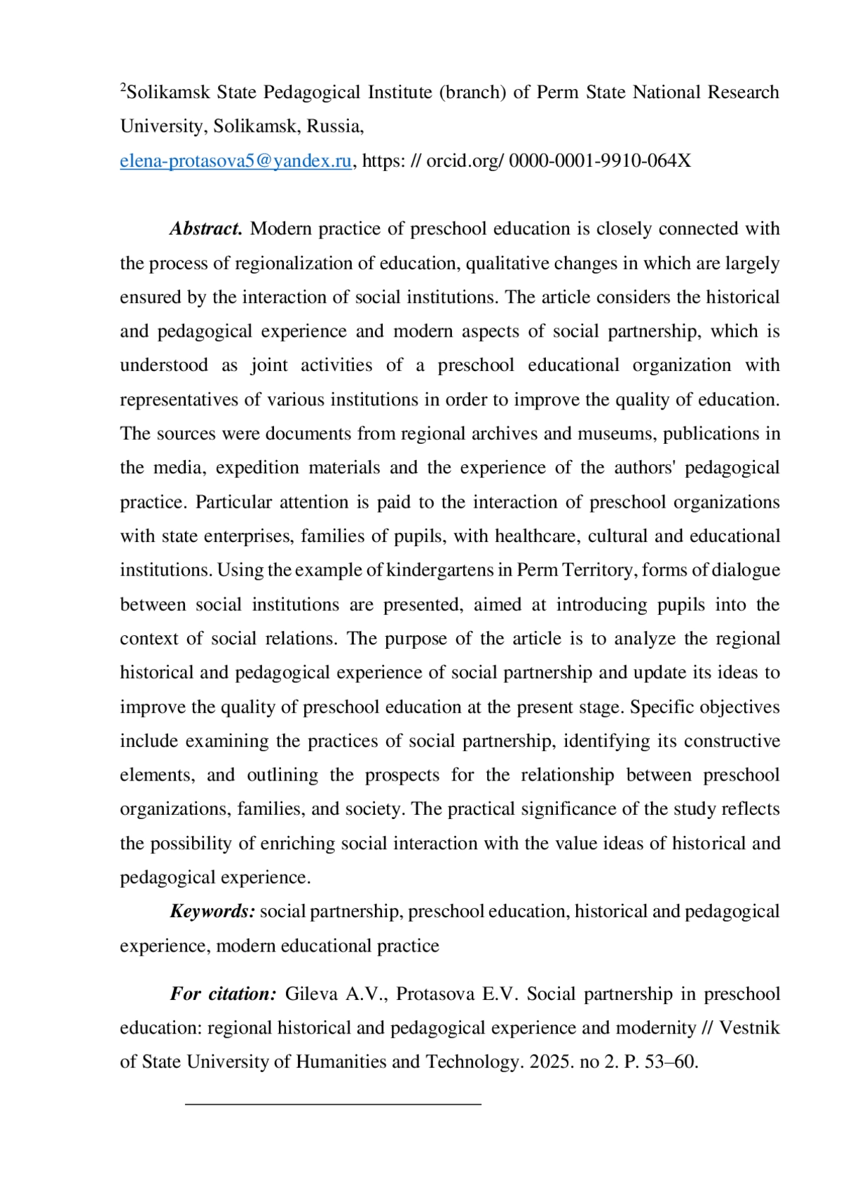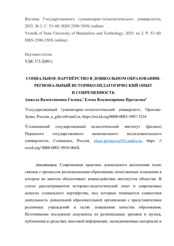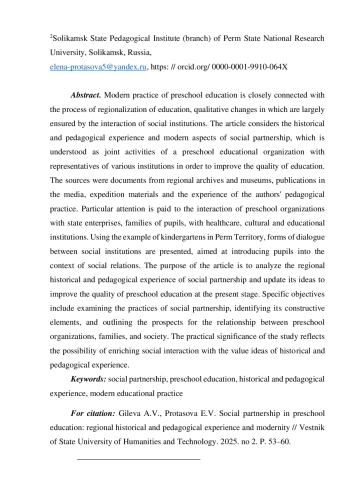 5. Гилева А.В., Протасова Е.В. Историко-педагогический опыт социального партнерства в дошкольном воспитании (на материалах Пермского края) // Диалоги о дошкольном образовании: материалы Международной научно-методической конференции, 5-6 декабря 2019 г. Псков: Псковский государственный университет, 2020. С. 66-73. EDN: BCKEZX
