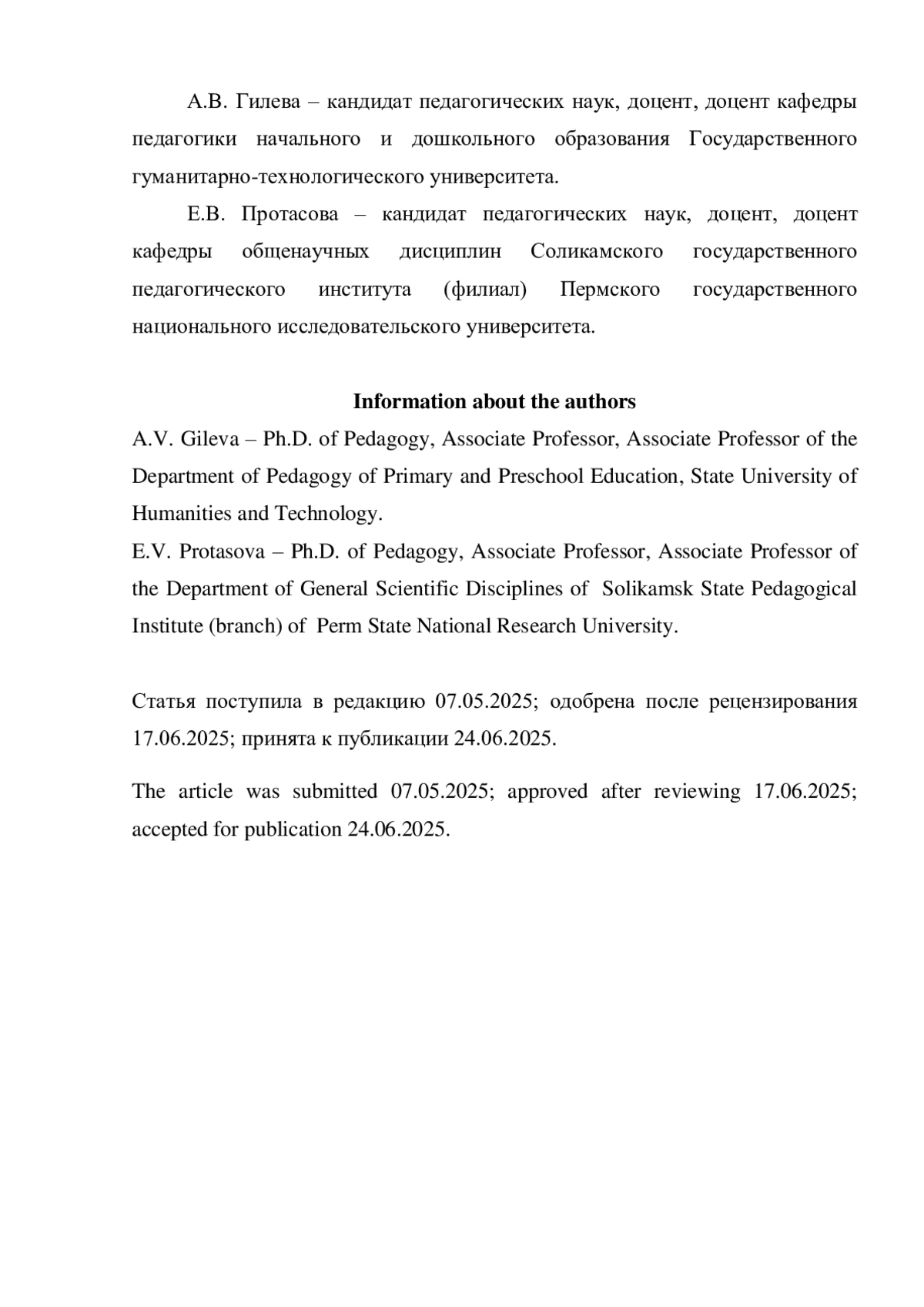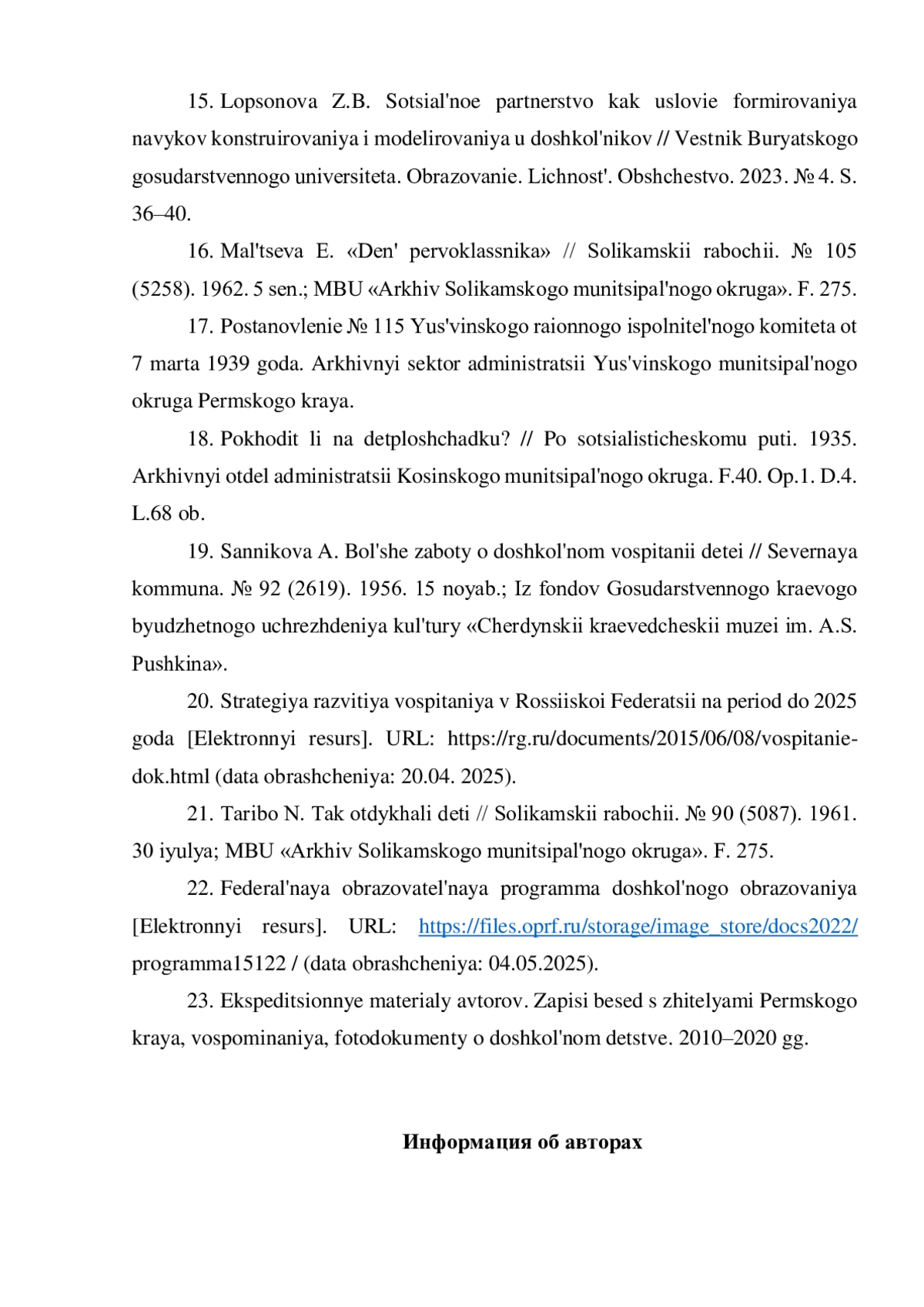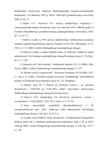 6. Гилева А.В., Протасова Е.В. История дошкольного воспитания в воспоминаниях жителей Пермского края (на материале 1970-1980-х годов) // Вестник Челябинского государственного педагогического университета. 2014. № 7. С. 63-77.