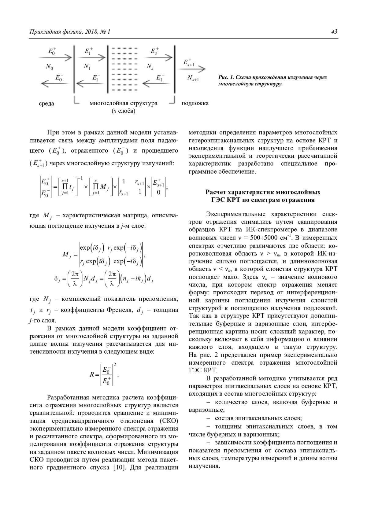 В работе проведено исследование спектров отражения многослойных гетероэпитаксиальных структур на основе КРТ, чувствительных в ИКдиапазоне. Разработаны модель спектра отражения многослойной структуры и сопровождающее программное обеспечение, позволяющие решать как задачу моделирования оптических характеристик многослойных структур, так и расчет характеристик эпитаксиальных слоев КРТ, входящих в состав многослойных структур, по результатам анализа экспериментально измеренных спектров отражения образцов многослойных структур.