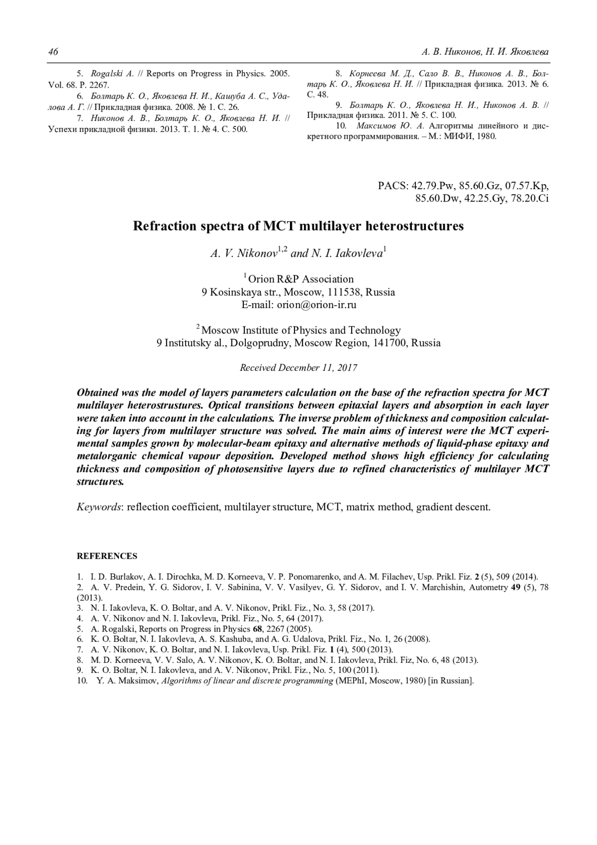 7. A. V. Nikonov, K. O. Boltar, and N. I. Iakovleva, Usp. Prikl. Fiz. 1 (4), 500 (2013).